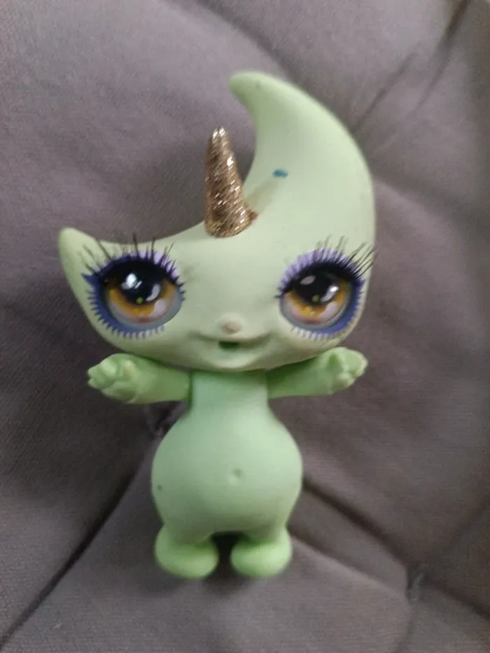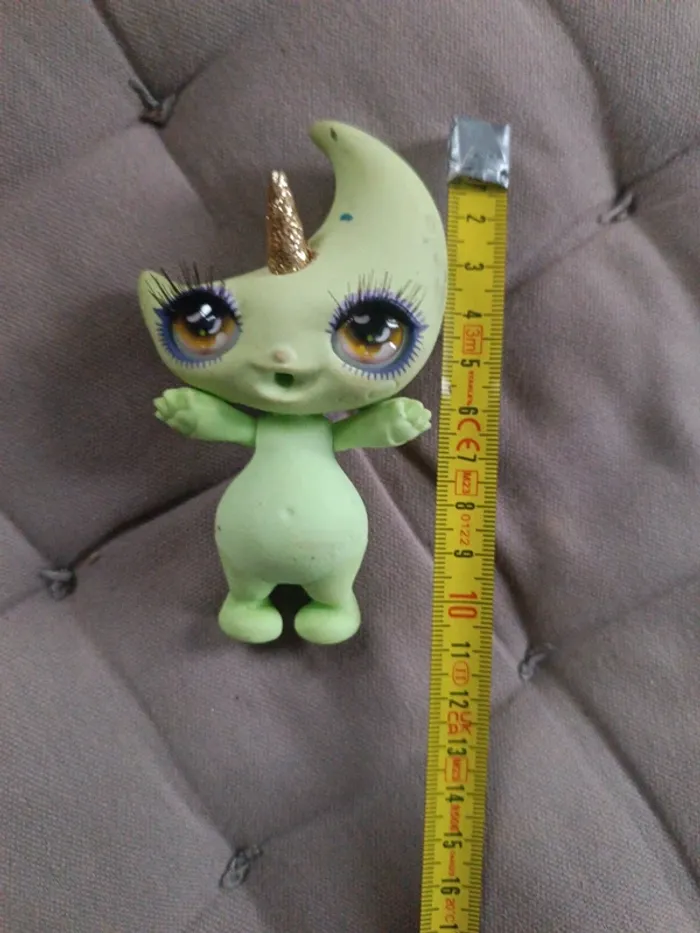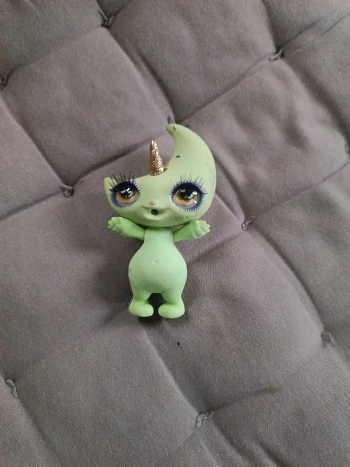 Figurine Moonie Poopsie 11 cm. Vert menthe . Quelques traces de stylo bleu. Plastique et silicone. Bon état