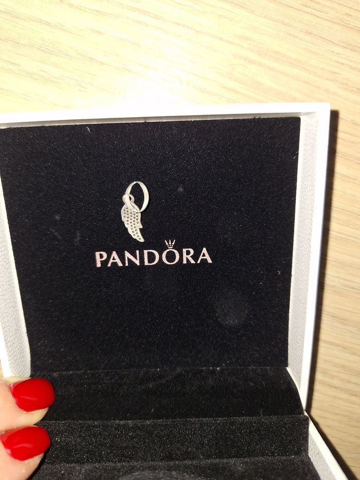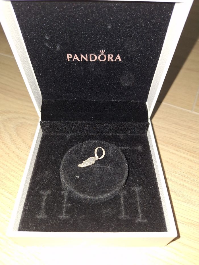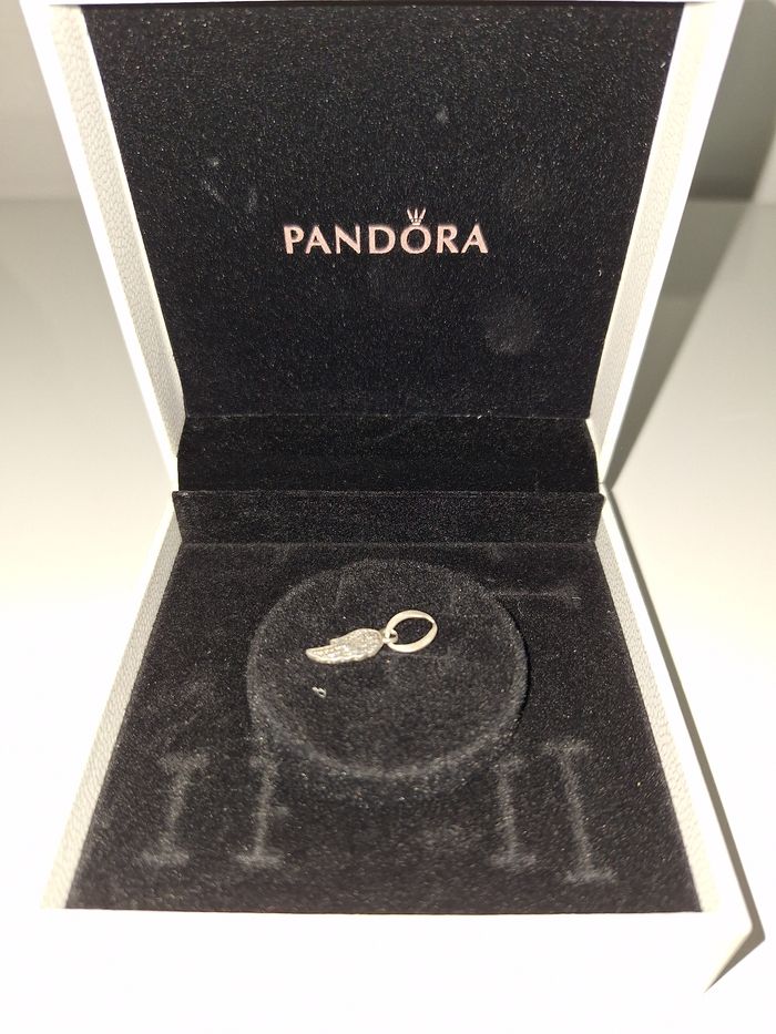 Pandora Charm médaillon aile d’ange avec un boîtier.