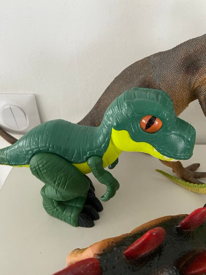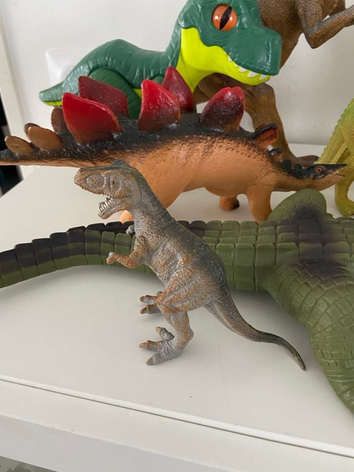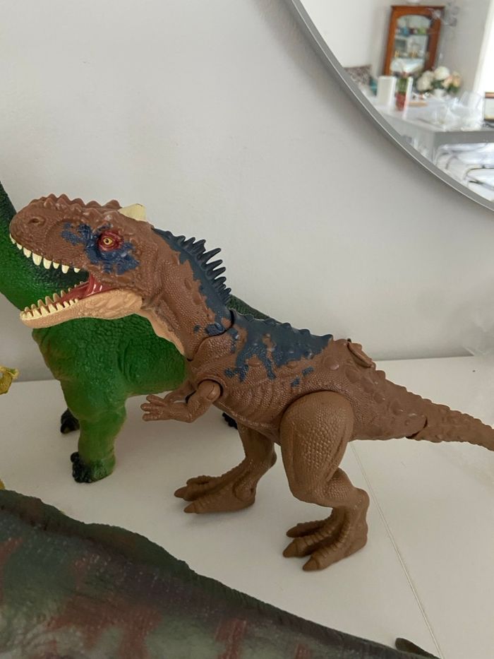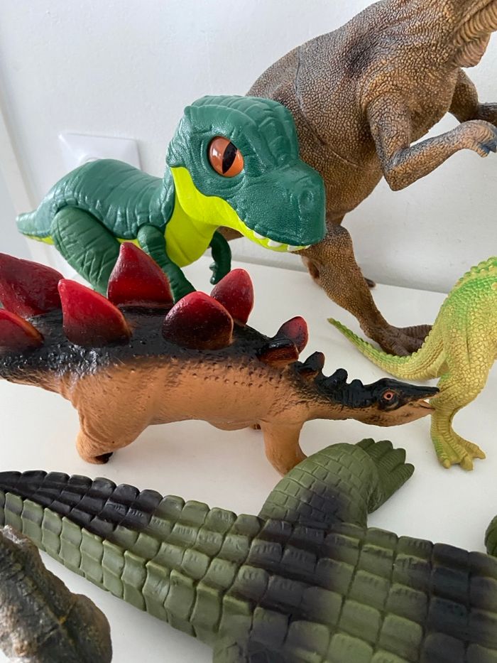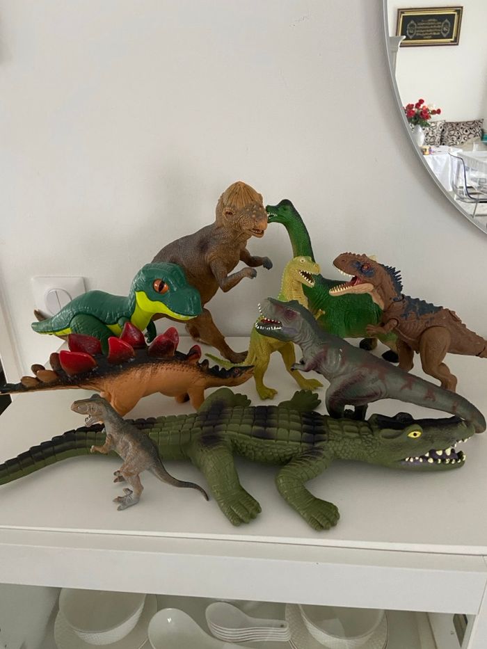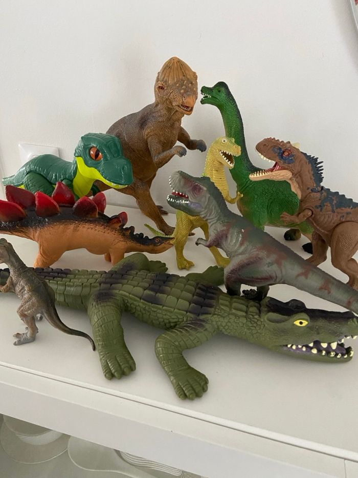 Je vends un lot complet de 10 grandes figurines représentant des dinosaures et reptiles, parfait pour les passionnés de préhistoire, les enfants, ou pour de la décoration. Les figurines sont de belle taille, solides, et plusieurs disposent de mâchoires articulées ou d’effets sonores. ⸻ 🦕 Contenu du Lot Voici la liste détaillée des figurines incluses : Grandes figurines : • 1 Grand Reptile type Crocodile / Alligator Couleur vert foncé, très long (≈ 30–40 cm) • 1 Grand Brachiosaure / Diplodocus Vert, long cou • 1 Grand Théropode (type T-Rex / Allosaure) Marron tacheté de bleu, mâchoire articulée • 1 Grand Théropode marron, très texturé Effets sonores Jurassic Park (fonctionne avec 3 piles – à prévoir) Mâchoire ouverte Figurines moyennes : • 1 Stegosaurus Marron avec grandes plaques rouges • 1 Pachycephalosaurus Marron, tête en dôme • 1 Théropode gris et rouge Mâchoire articulée • 1 Théropode jaune-vert vif En posture bipède Figurines petites : • 1 Petit Théropode gris • 1 Bébé dinosaure vert et jaune Grands yeux orange ⸻ 📐 État & Dimensions • Figurines d’occasion en bon état général • Tailles variées, allant du petit modèle au grand crocodile de 30–40 cm • Certaines pièces disposent de mâchoires articulées • Un dinosaure Jurassic Park sonore (bruitages) – nécessite 3 piles