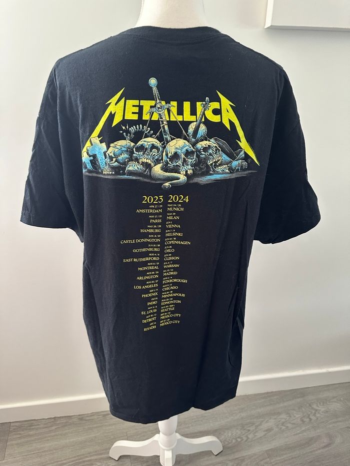 T-shirt - Excellent état - Metallica tournée 2023-2024 - Imprimés crânes - Noir, jaune et bleu - Manches courtes - 100% Coton - Acheté au Hellfest à Clisson Dimensions: - 58cm niveau épaules - 58cm niveau aisselles - 73cm de long