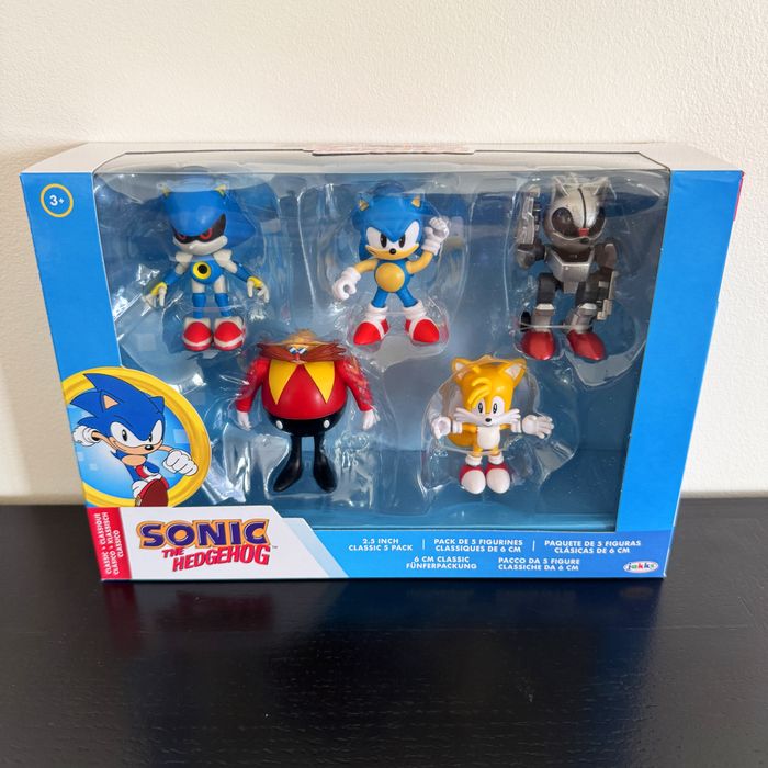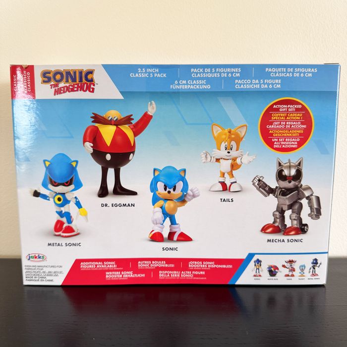 Coffret neuf, scellé, authentique, qui contient 5 figurines articulées des personnages Sonic, Dr.Eggman, Tails, MEtal Sonic et Mecha Sonic. Les figurines mesurent environ 6cm de hauteur.