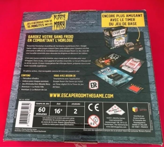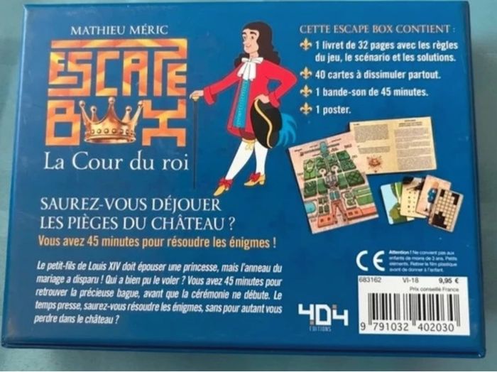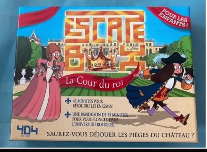 La cour du roi : 45 minutes de jeu avec 45 mns de bande son pour s'immerger dans l'univers du roi soleil à partir de 7 ans de chez 404 éditions La petite fille et la maison du lac : Nous avons commencé à le préparer mais nous n'y avons finalement pas joué. 60 minutes pour s'échapper, à partir de 16 ans pour 2 joueurs de chez Identity games Toutes les infos sont sur les photos, n'hésitez pas à bien tout regarder expédition rapide !