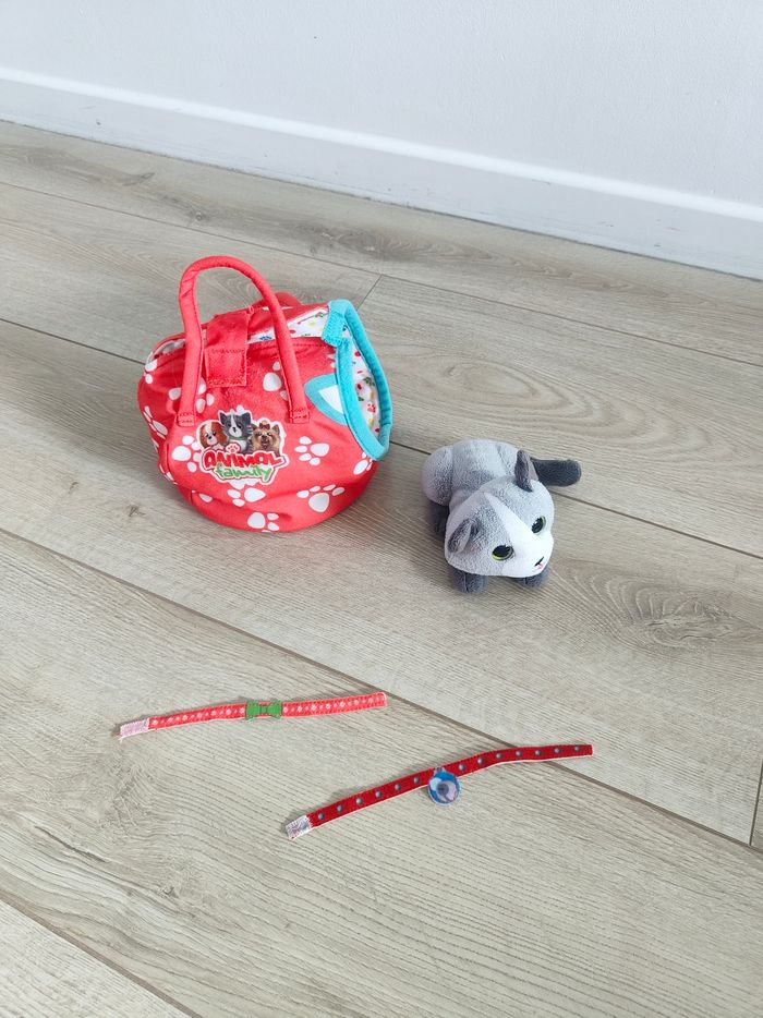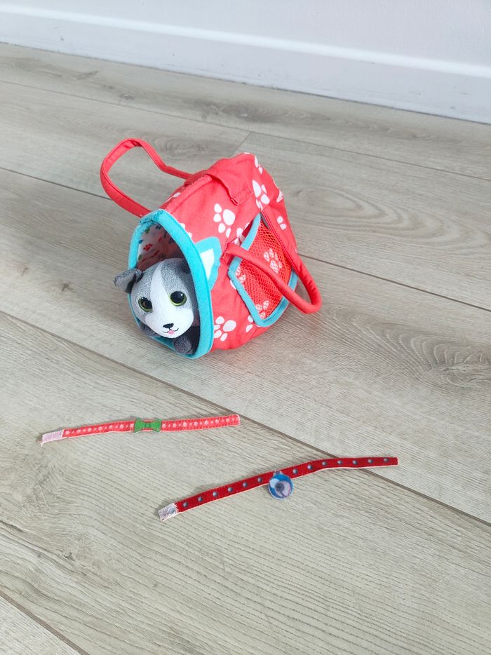 Vend petit chat (environ 15 cm) avec son sac de transport et deux colliers.