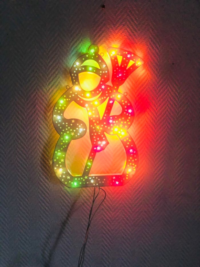 Bonhomme de neige électrique lumineux et coloré, parfait pour décorer votre intérieur pendant les fêtes de Noël. - Type de produit : Bonhomme de neige décoratif - Décoration : Lumineuse et colorée En très bon état Fonctionne sur secteur