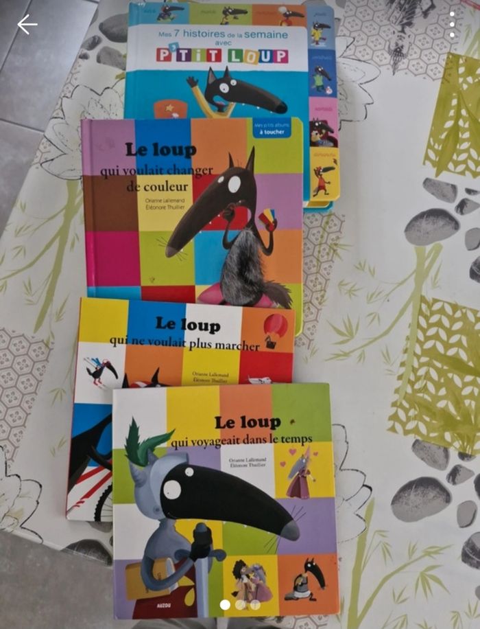 Ensemble livres Le loup, dont un livre a toucher avec différentes matières (14.95 prix d achat) et un sur les jours de la semaine (12.50 prix d achat). Les deux autres sont a 5.95 a prix d achat.