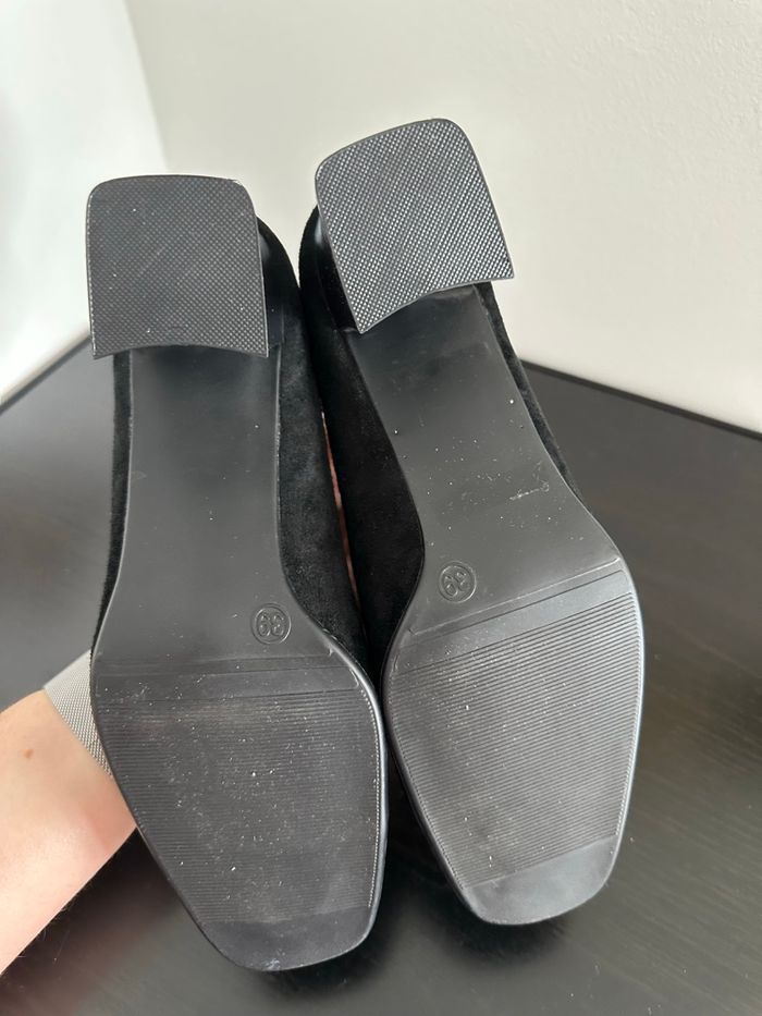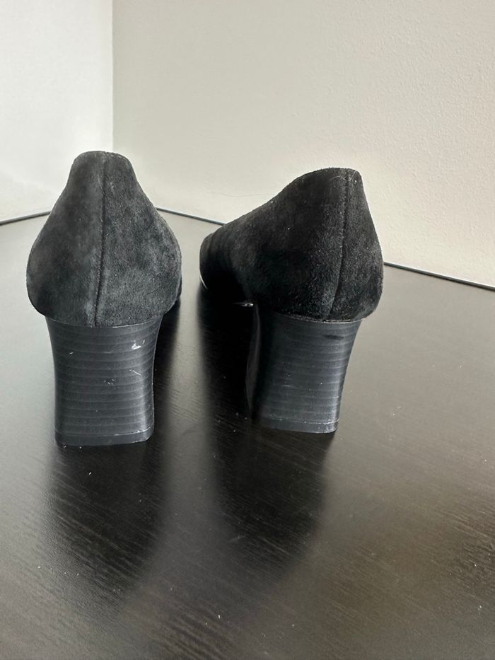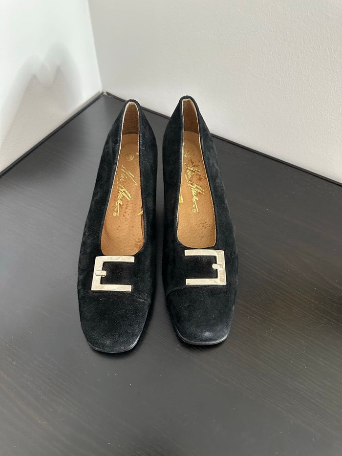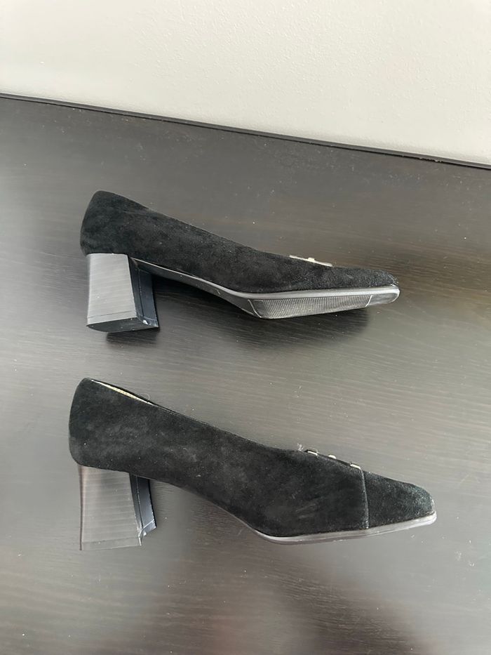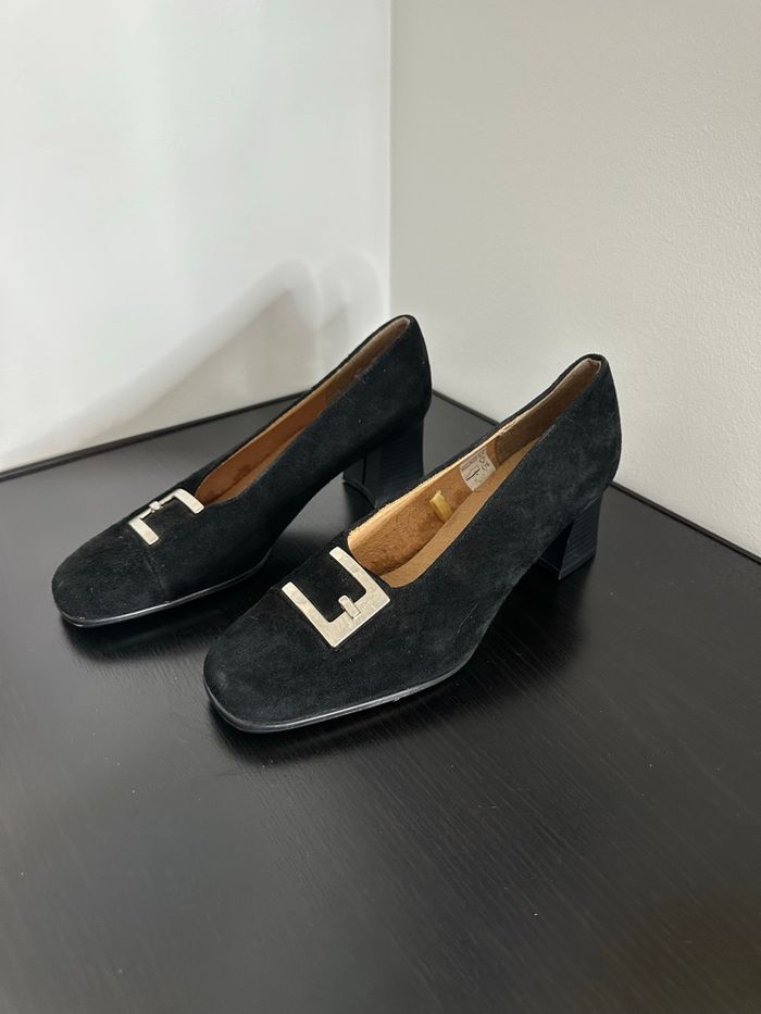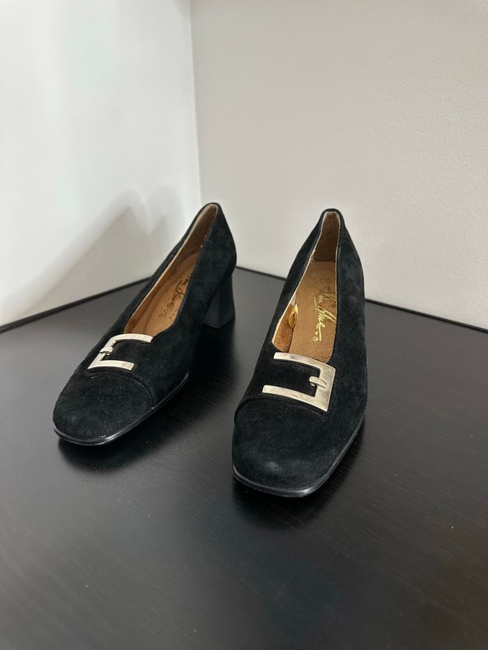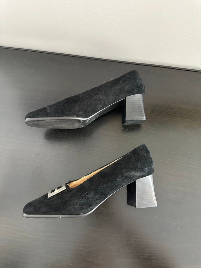 Escarpins - Excellent état - Pointure 39 - Couleur noire - Boucle métallique dorée - Talons carré 5,8cm - En cuir véritable et daim (touché velours) - Vintage, années 80’ Elles sont en excellent état, le flash fait des reflets sur le daim.