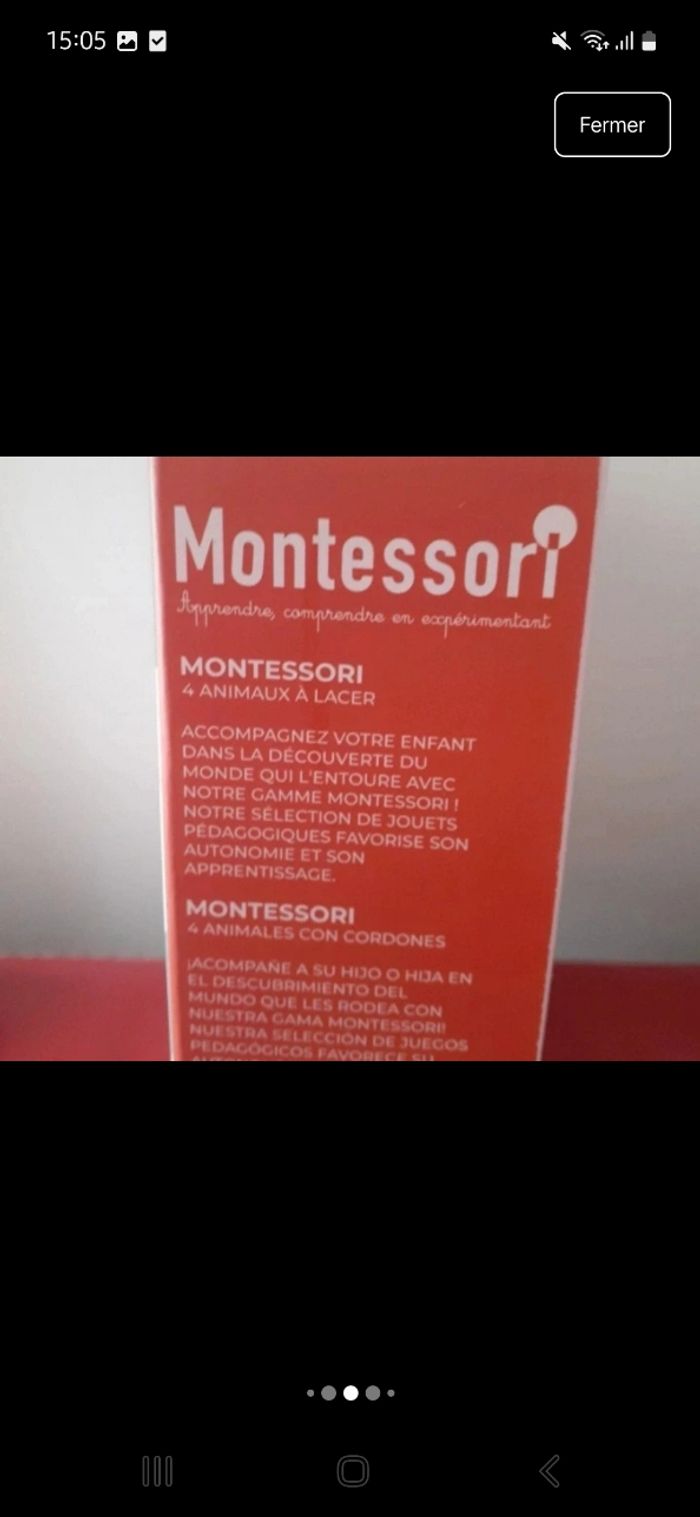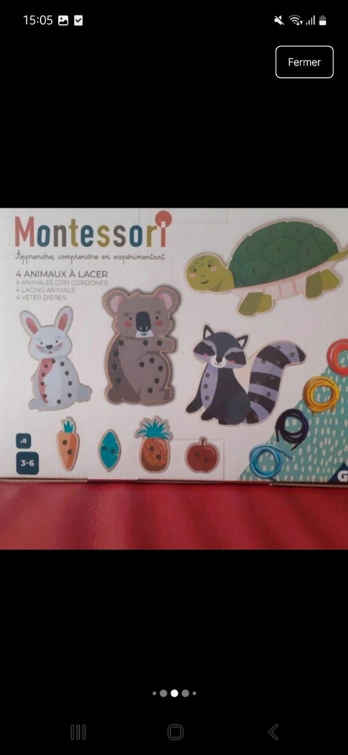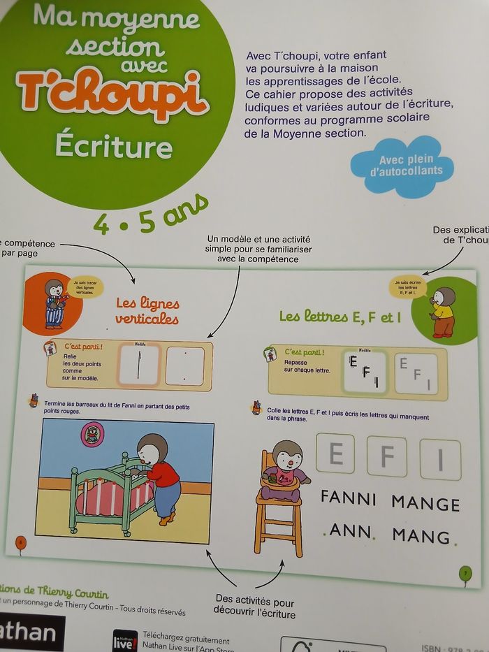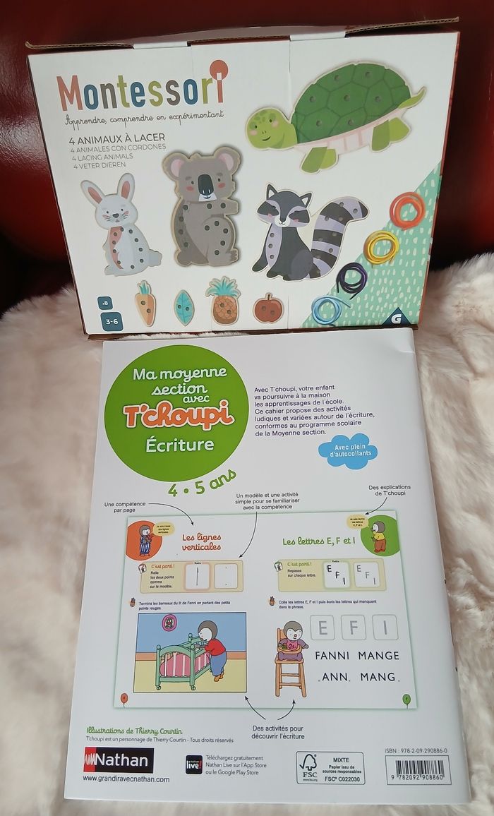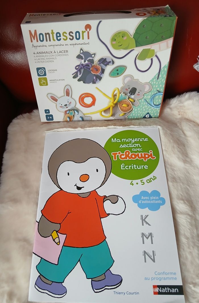 Articles neufs. Le lot comprend : 1/ Jeu de laçage marque Montessori ; présenté dans un coffret en carton avec poignée en plastique. Pour enfants de 3-6 ans selon le fabricant. Comprend 12 pièces : 4 animaux + 4 fruits + 4 lacets 2/ Livret neuf; 31 pages; avec autocollants; éditionsNathan. Activités pour enfants de 4-5 ans autour de l'écriture. Consignes données par T'choupi en haut de chaque page. À Noter : petit défaut d'origine au dos [ voir derrière photo ]