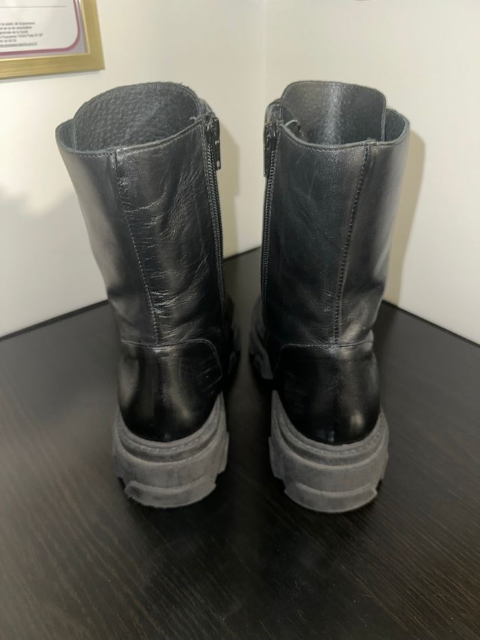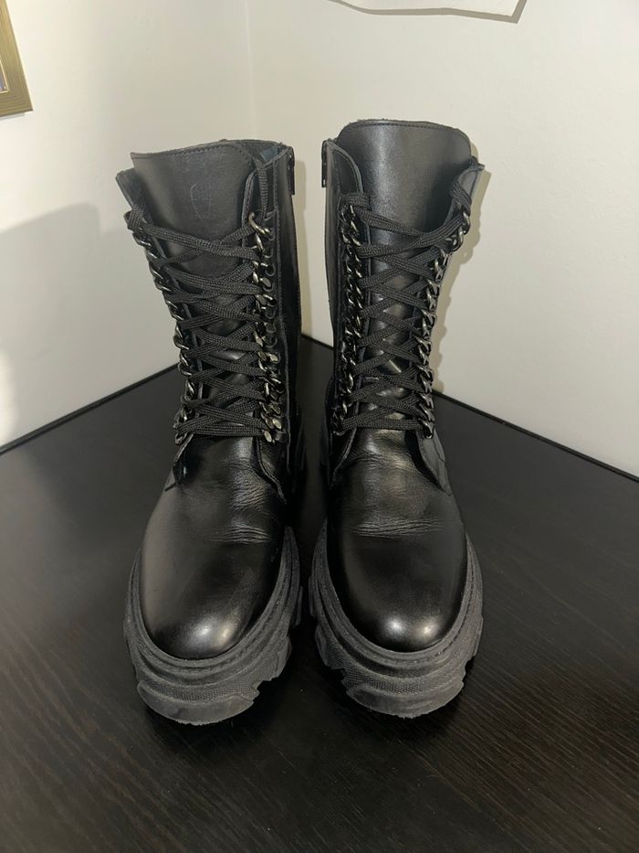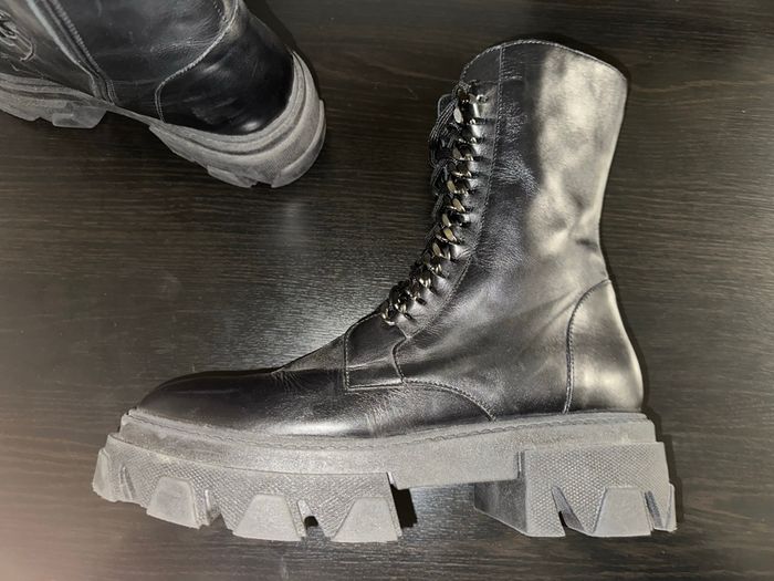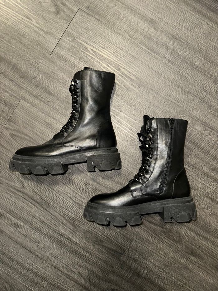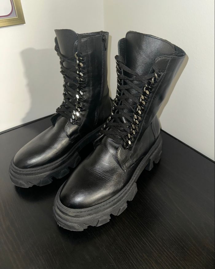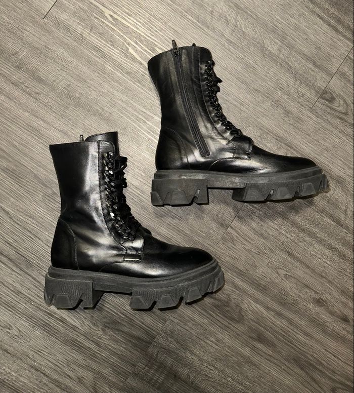 Bottines boots - Excellent état - Pointure 39 - Marque Impicci - En cuir véritable - Couleur noire - Zip à l’intérieur - Lacets et chaîne en métal - Fabrication italienne 🇮🇹 - Prix d’achat: 165 euros - Style rock, emo, goth, chic, punk, gothlolita Dimensions: - 4cm semelle avant - 5,5cm semelle arrière - 25cm hauteur totale de la bottine