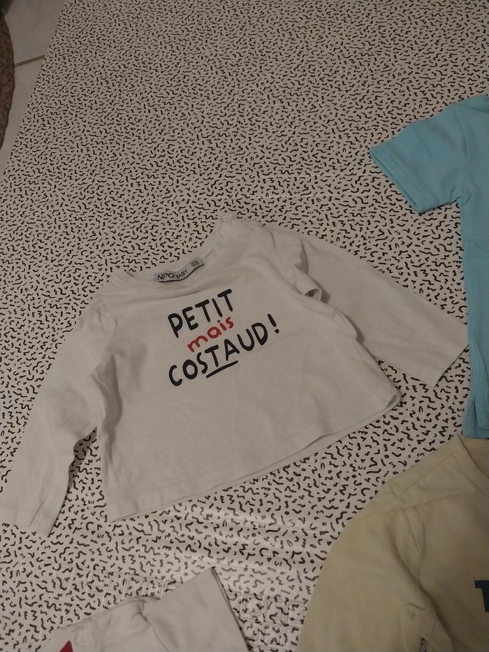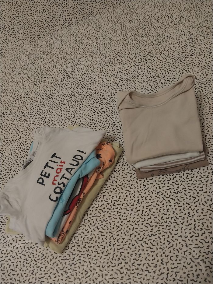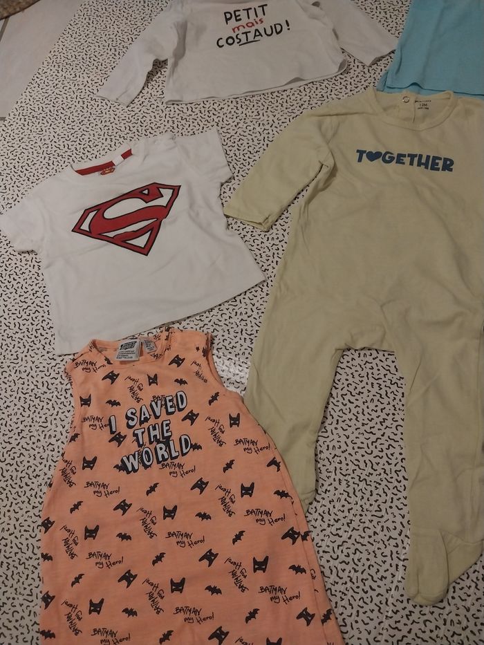 Super lot été 12 mois, idéal pour habiller bébé avec des tenues fraîches, pratiques et trop mignonnes ☀️👶 Contenu du lot : 👕 Tops / T-shirts : T-shirt blanc Superman T-shirt blanc manches longues “Petit mais costaud !” (léger, parfait pour soirées fraîches) Polo bleu clair (très bon état) 🩱 Pièces été : Barboteuse orange Batman “I saved the world” (parfaite pour les grosses chaleurs) 👶 Bodies manches courtes : Body beige imprimé ourson “Dans mes bras” Body rayé beige et blanc Body blanc uni Body beige clair 🩵 Autre : Grenouillère fine jaune TOGETHER (idéale nuit d’été) 👉 État : très bon état / bon état, propres et prêts à porter. #lotbebe #lot12mois #letebebe #vetementsbebe #tshirtbebe