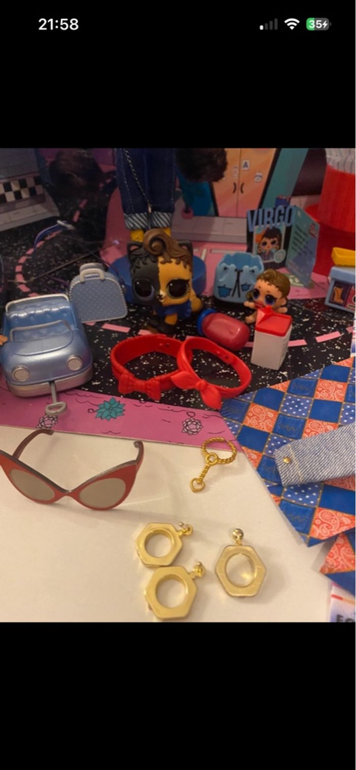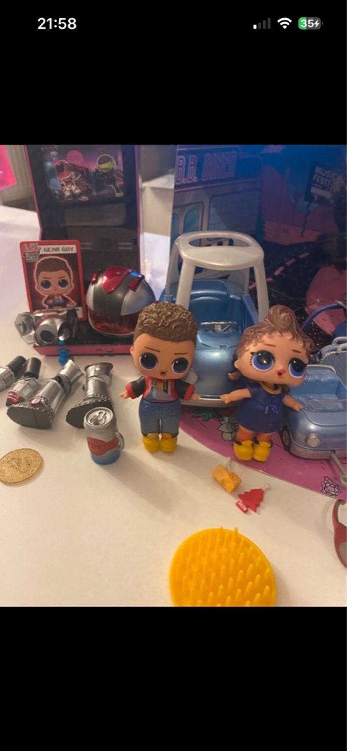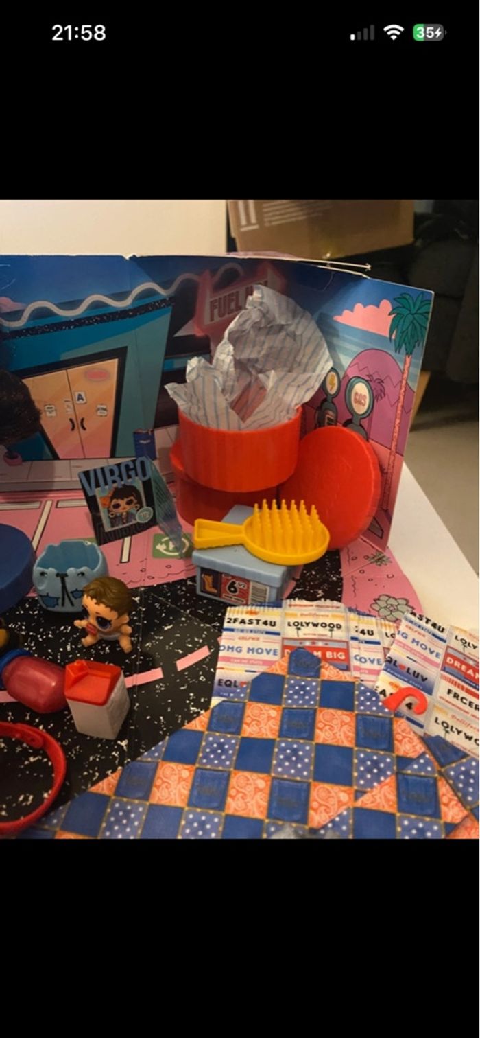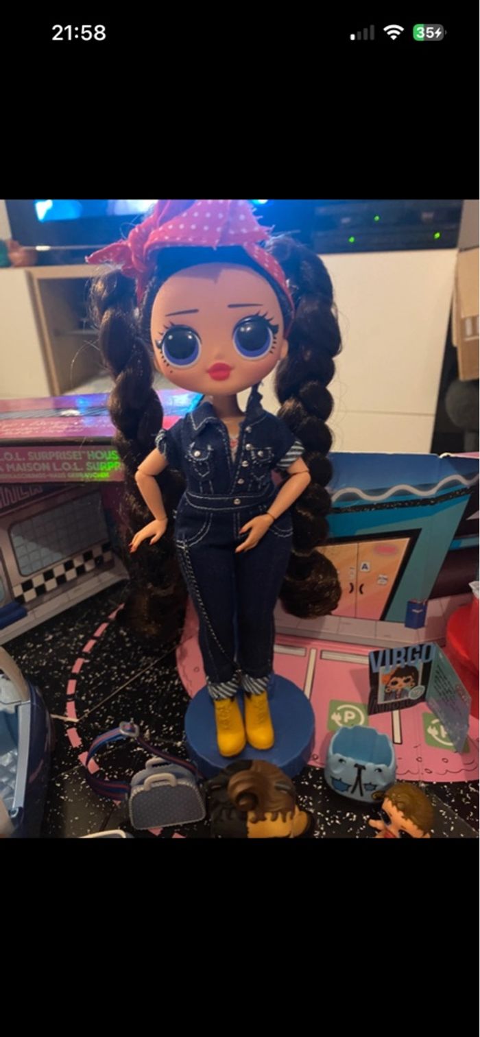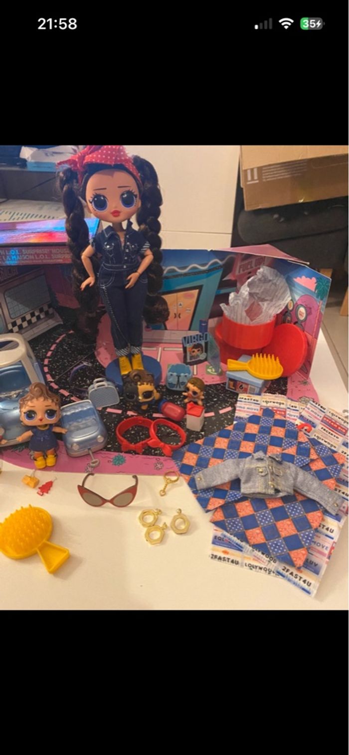 L.O.L. Surprise! 565116E7C O.M.G. Busy B.B. Fashion Doll with 20 Surprises Vendue sans boîte En excellent état - complet accessoires en sus Inclus également famille : LOL Can Do Baby + Boy Arcade : Gear Guy + Lil Can Do ainsi que le pet Can Do Kitty avec leurs accessoires Ainsi que le plateau Road trip avec la voiture
