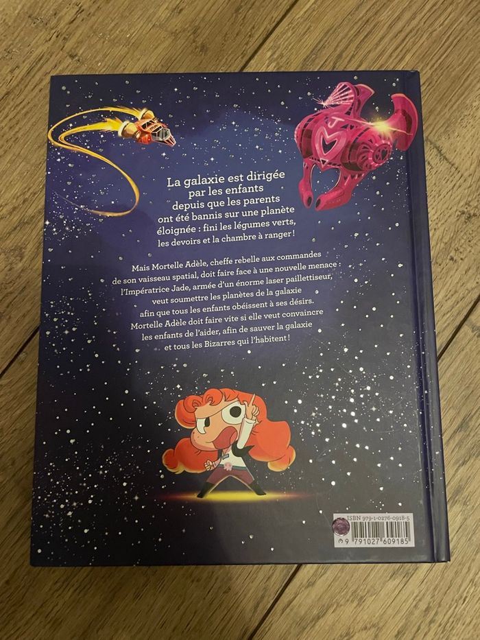 "Embarquez pour une grande aventure au fin fond de la galaxie avec Mortelle Adèle ! La galaxie est dirigée par les enfants depuis que les parents ont été bannis sur une planète éloignée : finis les légumes verts, les devoirs et la chambre à ranger ! Mais Mortelle Adèle, cheffe rebelle aux commandes de son vaisseau spatial, doit faire face à une nouvelle menace : l'Impératrice Jade, armée d'un énorme laser paillettiseur, veut soumettre les planètes de la galaxie afin que tous les enfants obéissent à ses désirs. Mortelle Adèle doit faire vite si elle veut convaincre les enfants de l'aider, afin de sauver la galaxie et tous les bizarres qui l'habitent !"--Publisher's website.