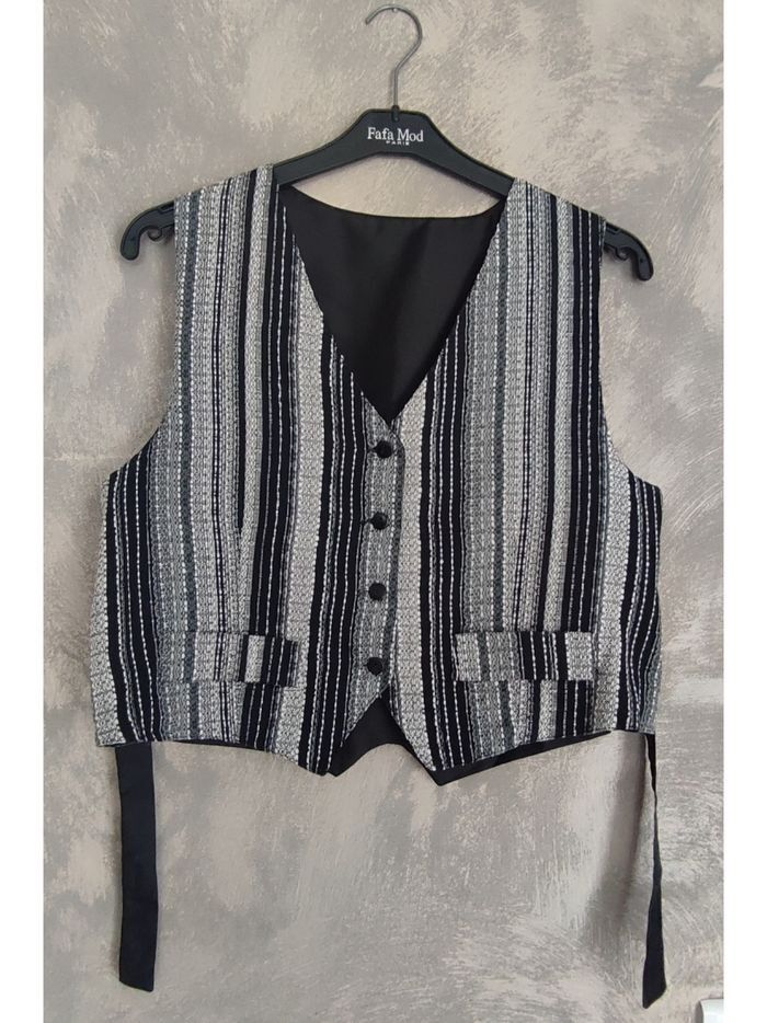 Équivalent à un 38 Largeur d'épaules 35 cm, sous aisselles 50 cm, longueur 51 cm, lien de serrage dans le dos. Fabriqué en France Maison non fumeur sans animaux