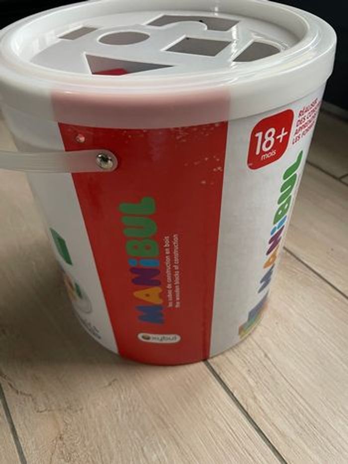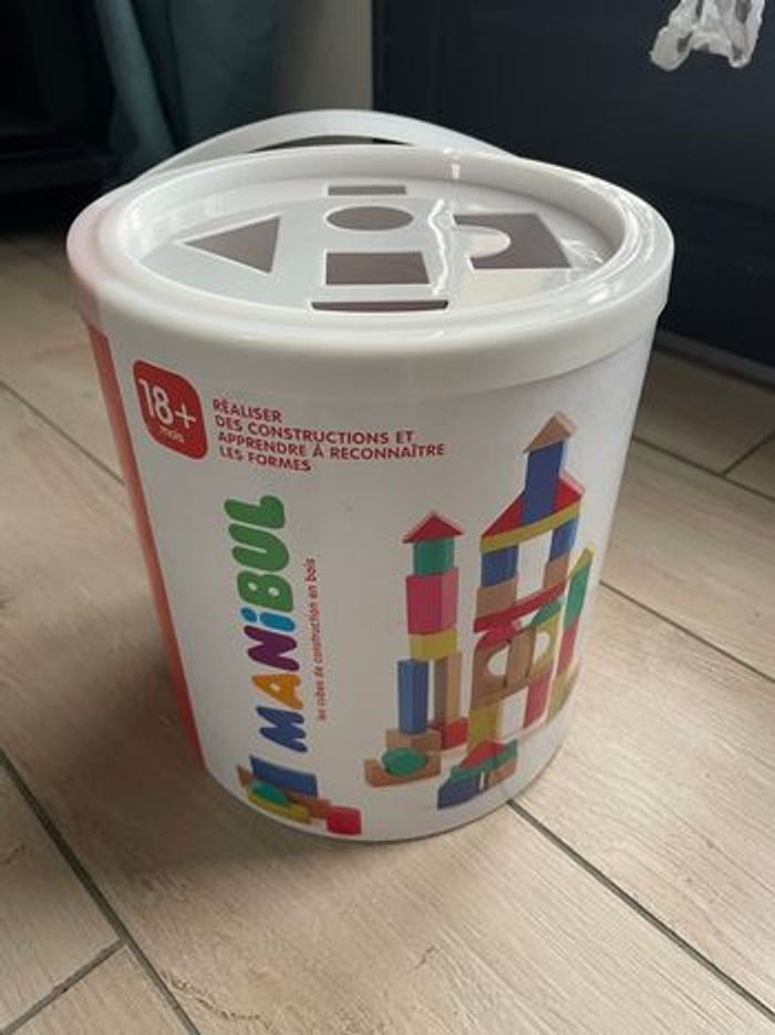 Seau avec cubes de construction en bois Servi 1 ou 2 fois Quelques très légères marques sur la boîte De