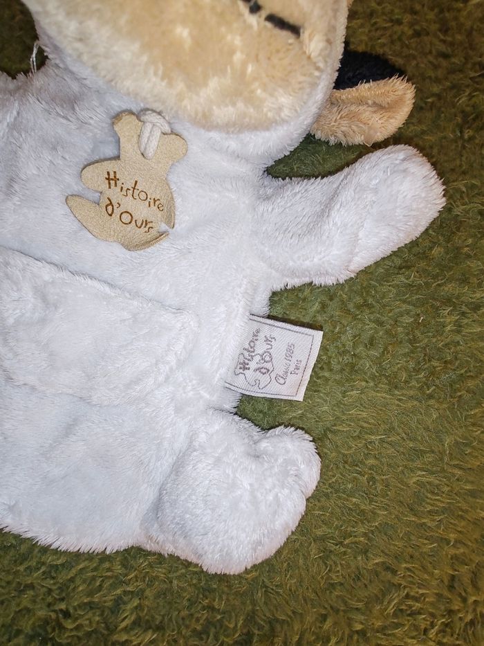 Doudou Vache Marionnette Blanche et Noire Poche Histoire d’Ours Étiquette marque présente 12 euros Envoi en relais