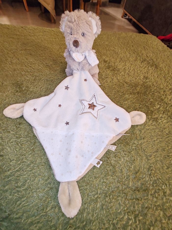 Pommette Intermarché doudou ours mouchoir beige blanc gris étoile Étiquette marque présente 9.90 euros Envoie en relais