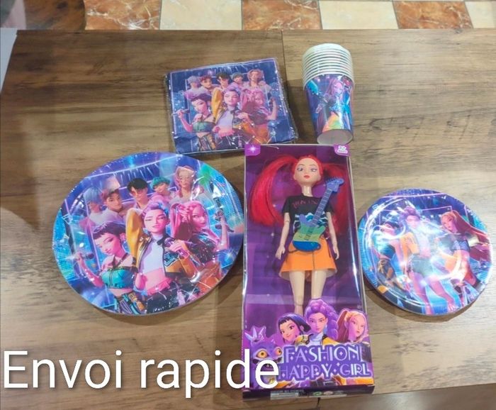 Spécial anniversaire k pop neuf 1 poupée 10 assiettes carton 10 assiettes dessert carton 10 verres 20 serviettes en papier