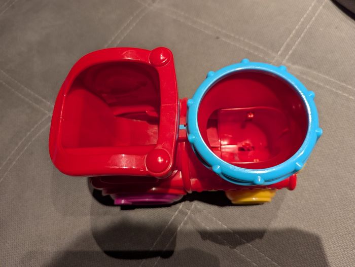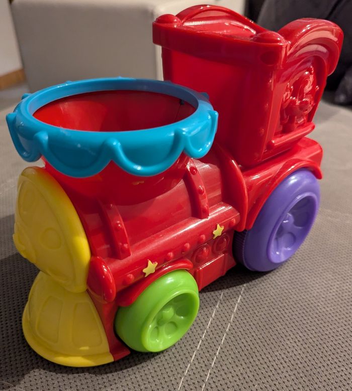 Jeu très amusant Playskool: quand on fait avancer le train, les balles sautent par la cheminée !
