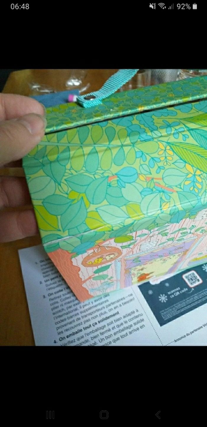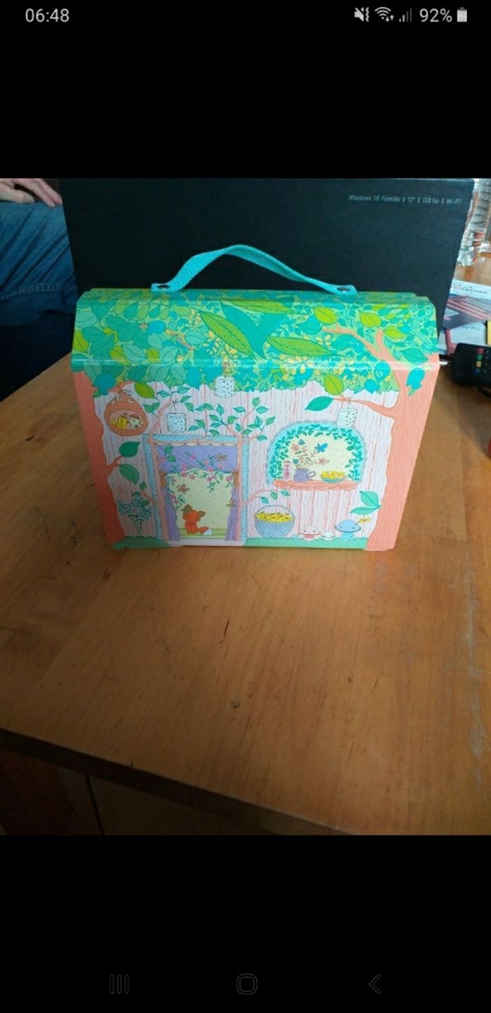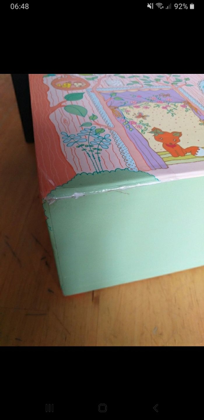 Maison de poupee avec sa poupée, son accessoire (bougeoir) et son animal de compagnie (renard). Les petits accessoires qui ne sont pas d'origine sont ajoutés gracieusement. Interieur en tres bon etat mais la maison est légèrement usagee en dessous, et rescotchée sur un angle, petit défaut sur le carton, voir 2 dernieres photos