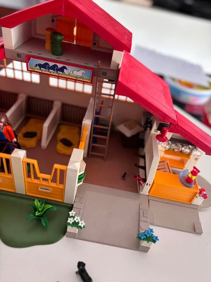 Grand centre équestre / haras / écurie avec 5 espaces de jeux: boxes, grenier à foin, manège, cafétéria, espace de sellerie. Portes du grenier s'ouvrent. Comprend 3 personnages, 3 chevaux, souris et chat. Il comporte de nombreux accessoires : brouette, carottes, plateau, verres, briques de jus, abreuvoir, barrières de saut, produits pour chevaux, cravache, brosses.... En très bon état