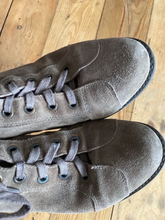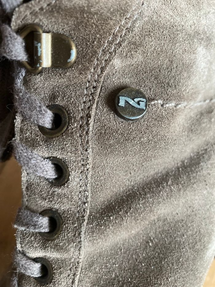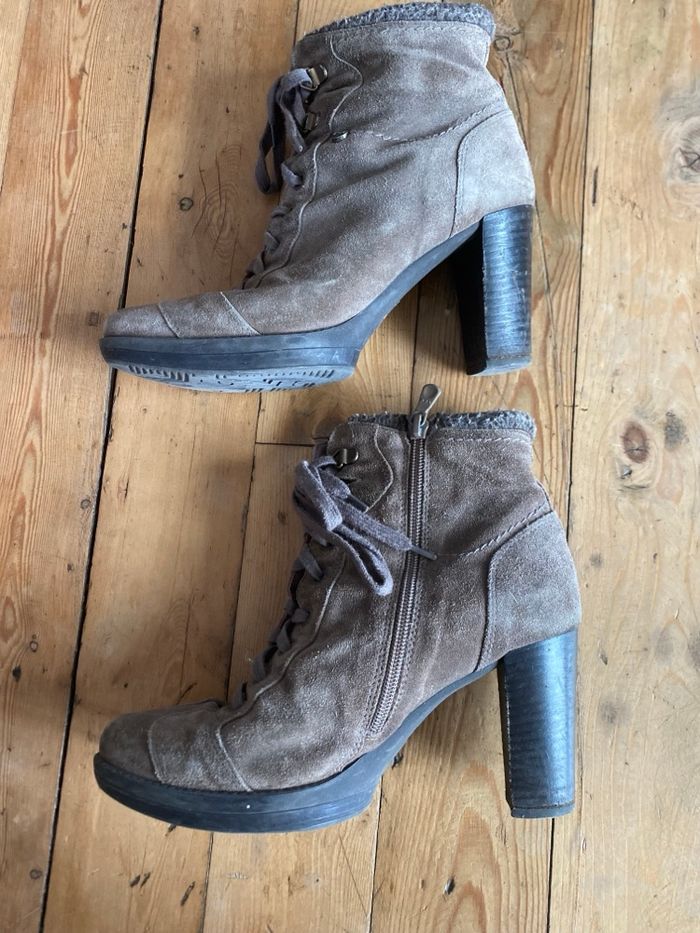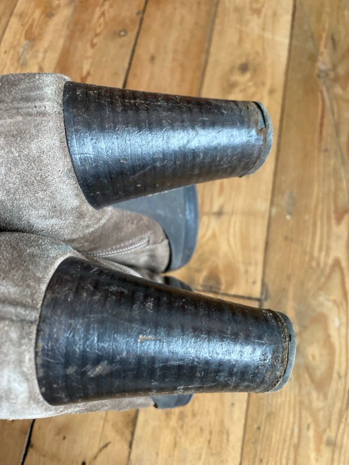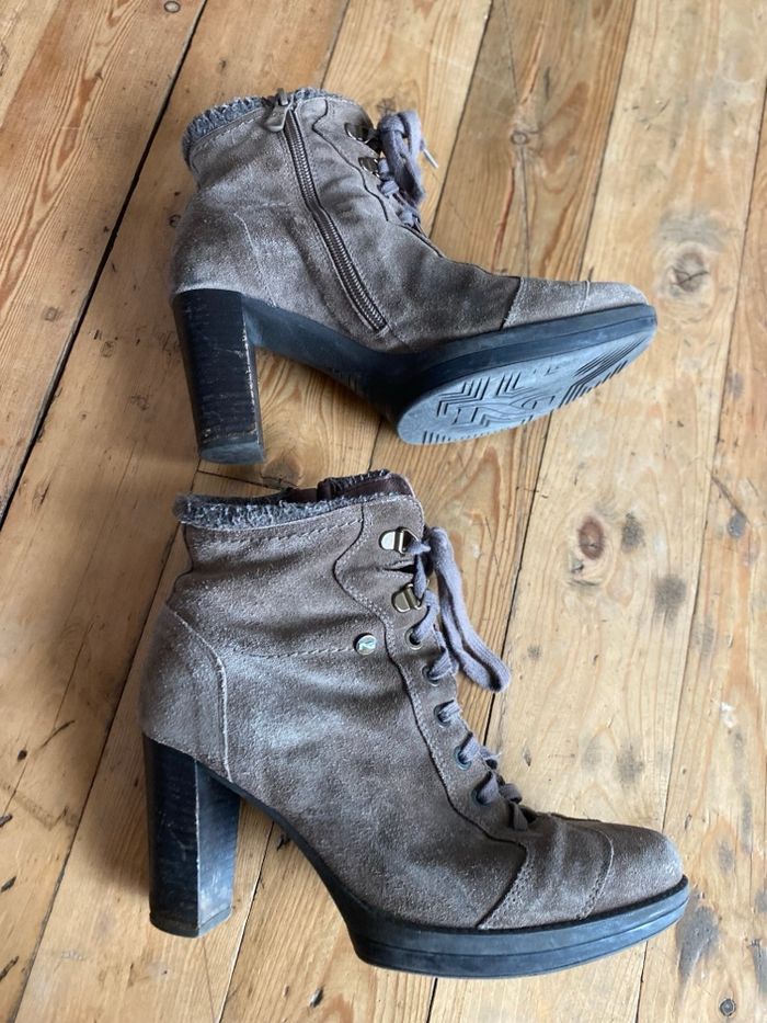 Bottines tout cuir daim beige kaki Très confortable à la marche grâce à la semelle plateforme Entièrement doublé cuir Fermeture YKK Pointure 38 Nero Giardini made in Italie 🇮🇹 Très bon état général toutefois une bande de cuir serait à refaire par un cordonnier sur le bas d'un talon , voir sur la dernière photo. Hauteur talon 8,9 cm Hauteur semelle plateforme 1,9 cm Ce qui ramène à une marche idéale de 7 cm
