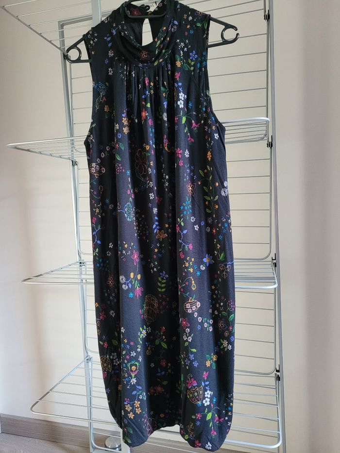 Robe doublée fluide légèrement resserrée en bas. Taille 38/40. 100 % polyester. Longueur 95 cm. Largeur aisselle à aisselle 48 cm Mamatayoe