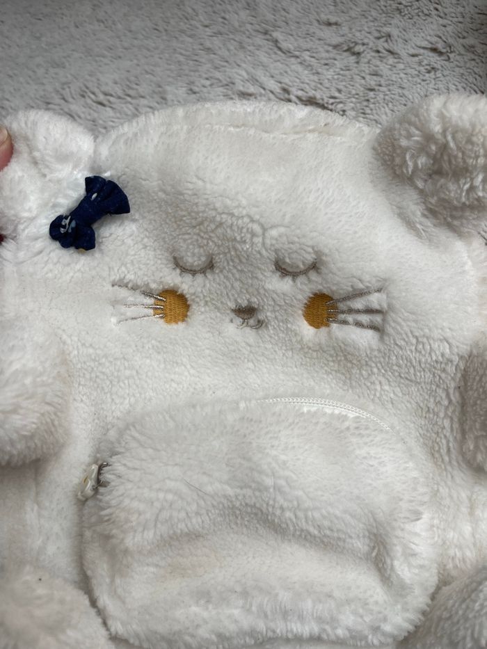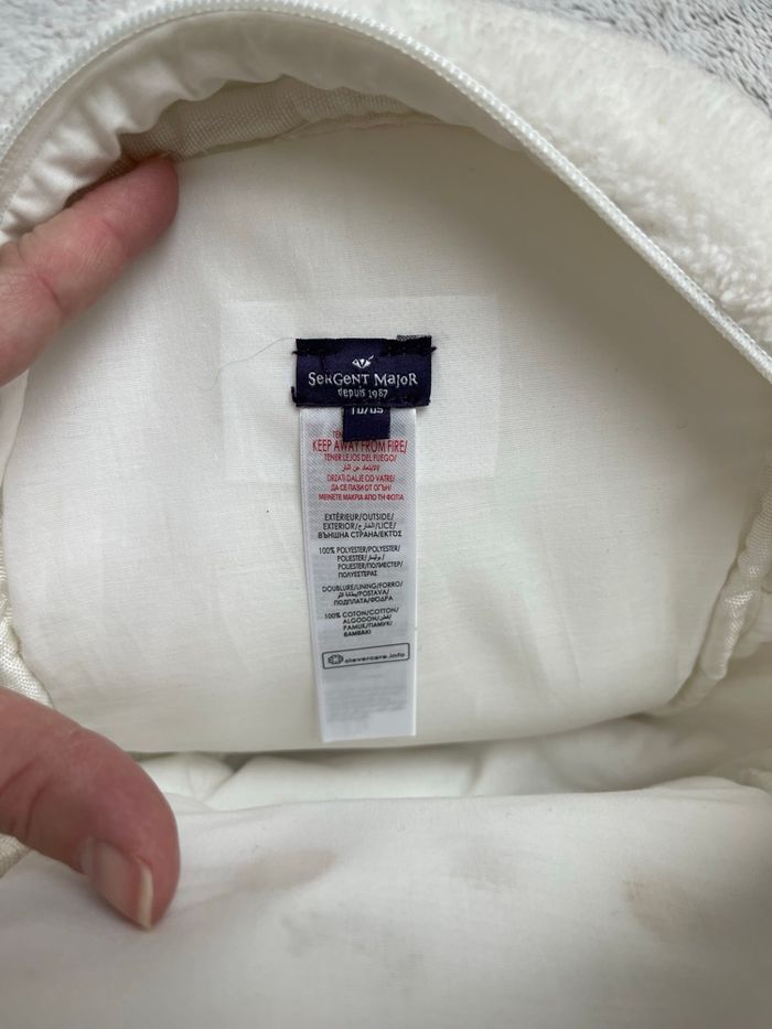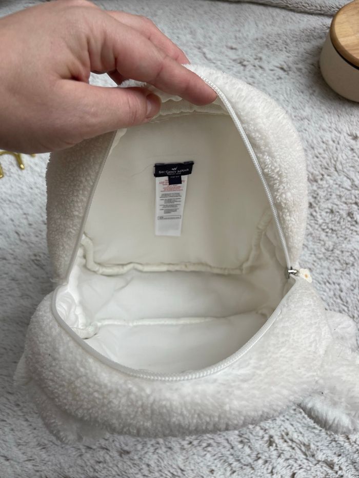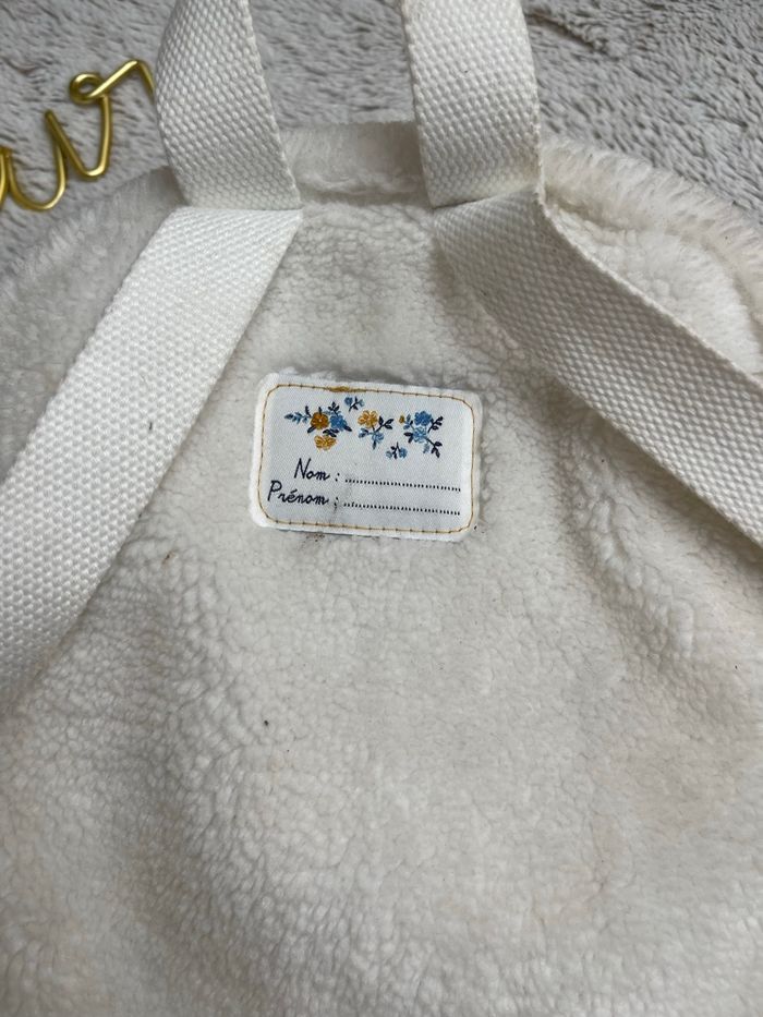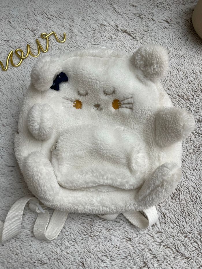Sac à dos fausse fourrure de couleur écru Broderie visage chaton sur le devant SERGENT MAJOR" Bretelles réglables avec boucle réglable Anses main Zip Hauteur 23.5cm Largeur 19cm Profondeur 9cm Très bonne état Idéal pour la crèche ou une rentrée en petite section Sergent major