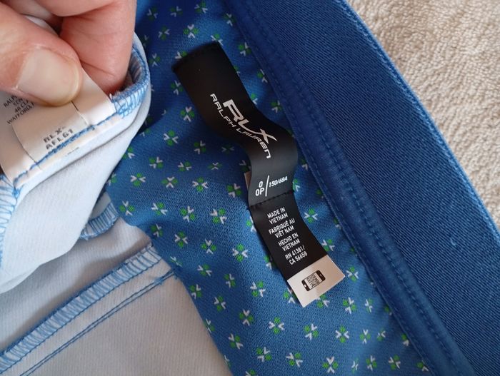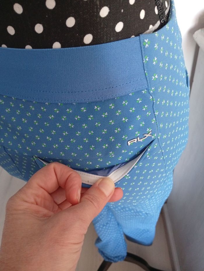Remise sur lot activé. Pantalon en nylon stretch pour femme. En très bon état voir neuf. Couleur bleue ( presque turquoise) avec petites fleurs blanches et vertes. Le pantalon RLX Eagle est fuselé et extensible pour un confort et une liberté de mouvement optimaux. Il est doté d'un élastique à l'arrière de la taille pour un confort accru et de poches pratiques ( et grands pour un pantalon femme !!!) pour emporter vos essentiels du quotidien. Marque: RLX Ralph Lauren Taille: US: O- OP/150/68A FR: 34 Mesures approximatives Longueur: 95cm Ceinture: 31cm , extensible jusqu'à: 36cm 85% Nylon 15% Elasthane #pantalonrlx #pantalonralphlauren #pantalonralphlaurenfemme #pantalonralphlaurenfemme34 #pantalonralphlauren34