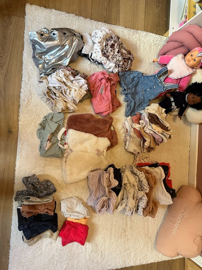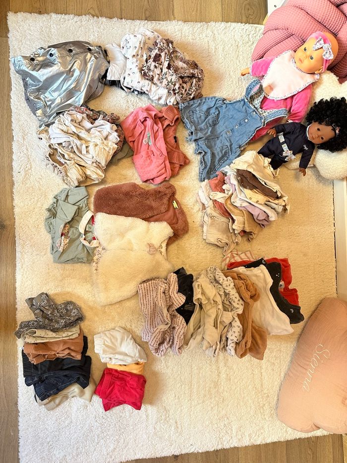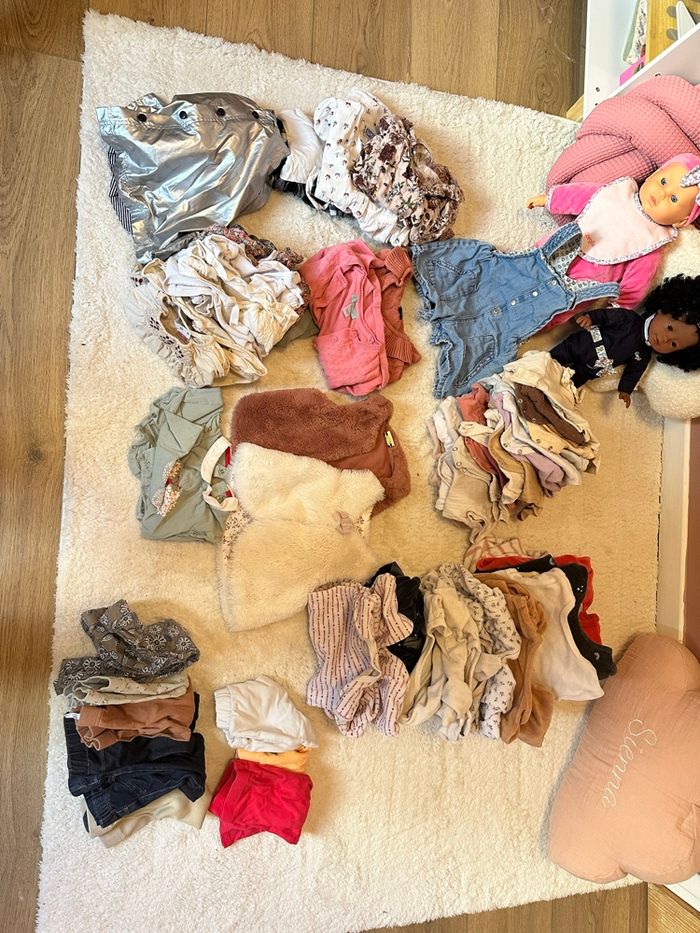 Comprends beaucoup de vêtements - 10 pyjamas velours (la plupart sont des petits bateaux) - 1 barboteuse salopette en jean obaibi - 1 barboteuse obaibi - une quinzaine de bodys (quasi tous H&M) - 2 gilets fausse fourrure sans manche - 8 hauts - 5 pantalons / leggins - 3 shorts - 2 gilets - 3 robes - 1 imper