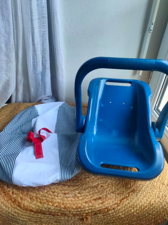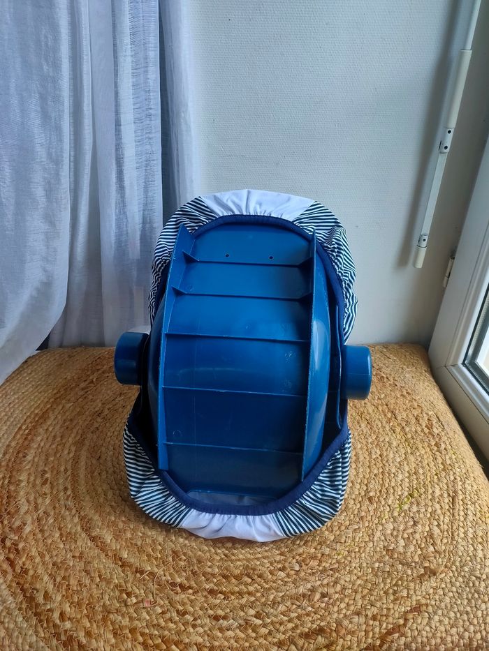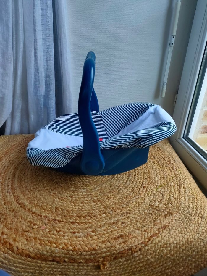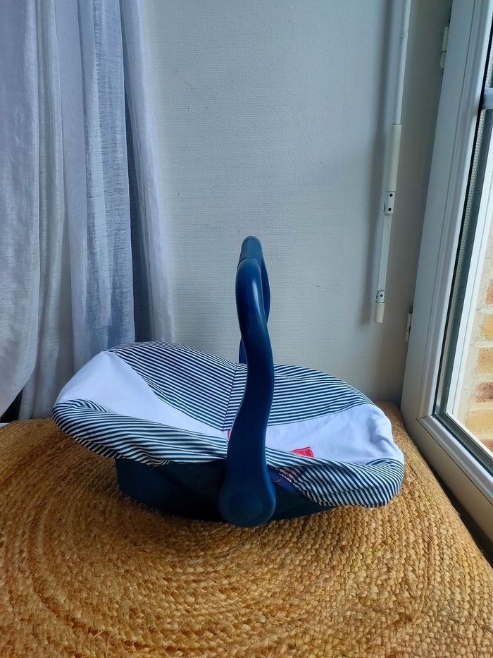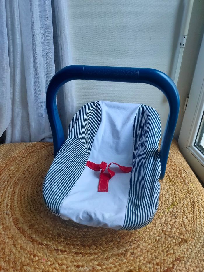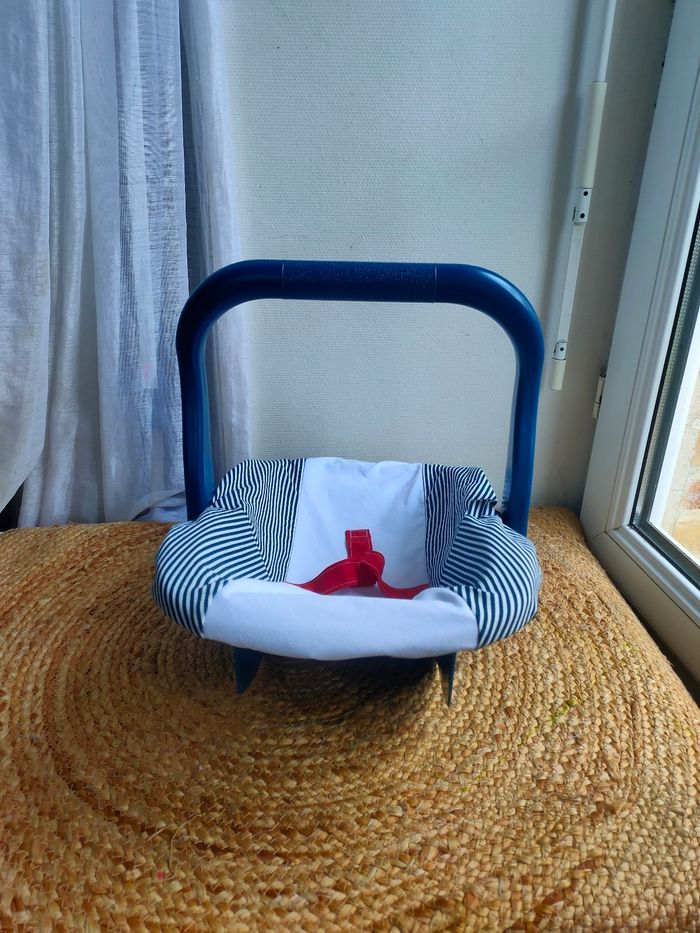 Cosy pour poupée coloris bleu marine et blanc a rayures. Sangle pour maintenir la poupée. Le cosy est d'occasion et c'est un modèle Vintage, il a quelques traces, la housse du cosy et neuve et a été faite a la main. De ce fait le cosy est unique, il n'y en aura pas 2 comme celui-ci. Prix ferme, PAS DE NÉGO !!!