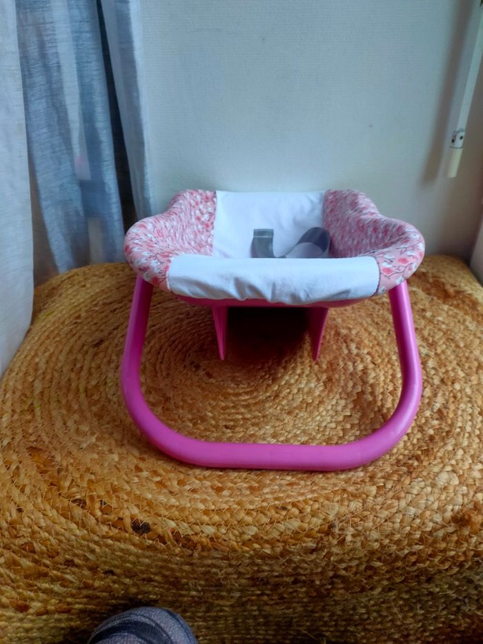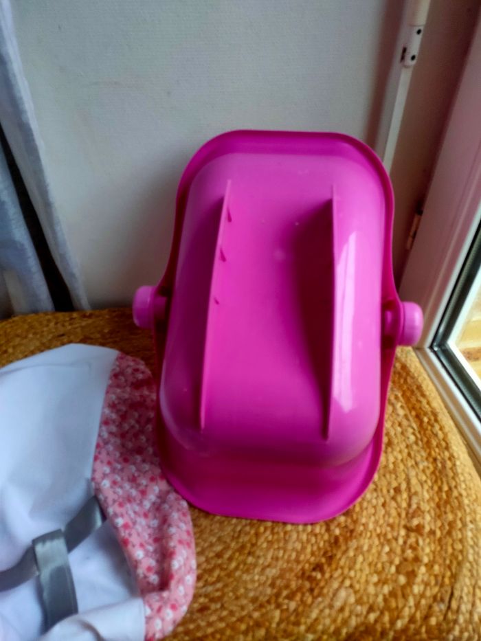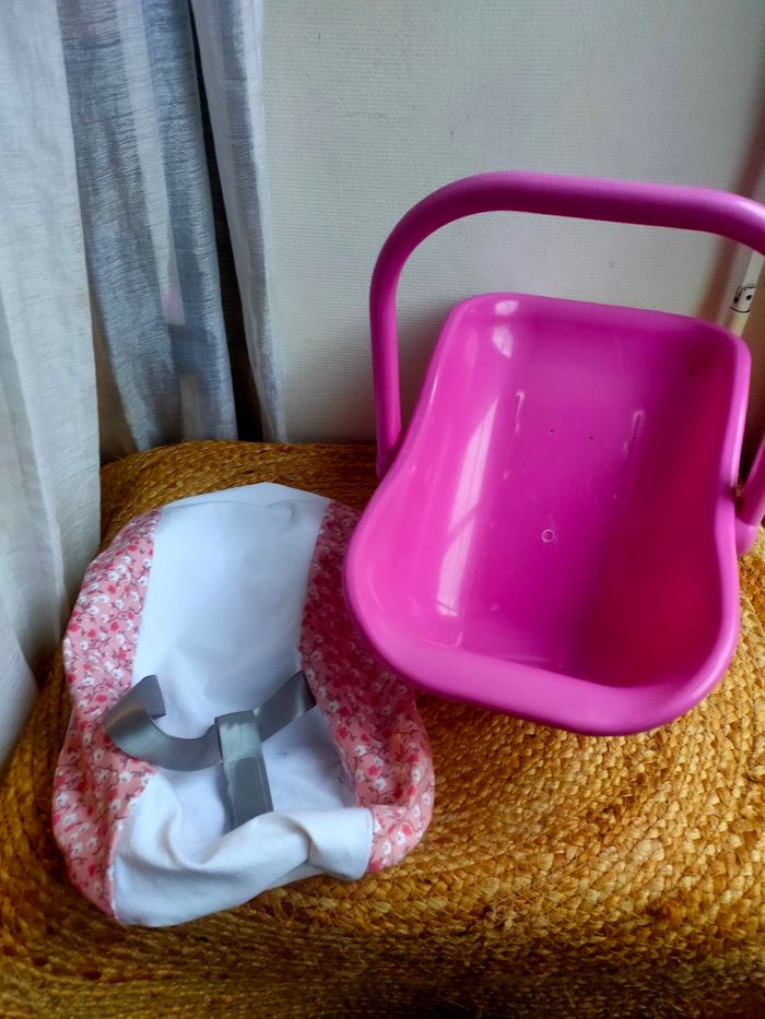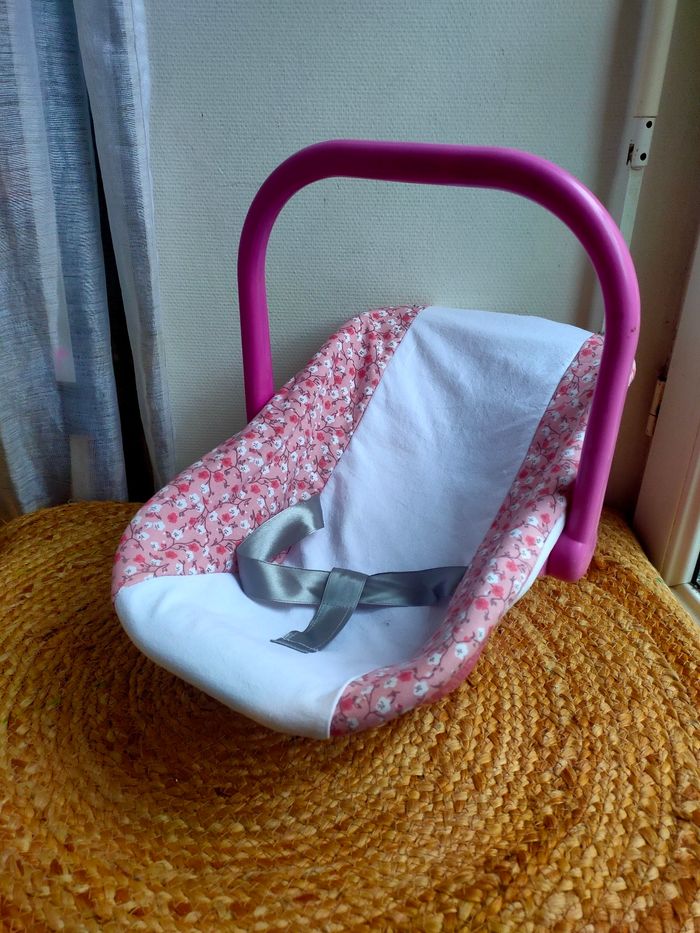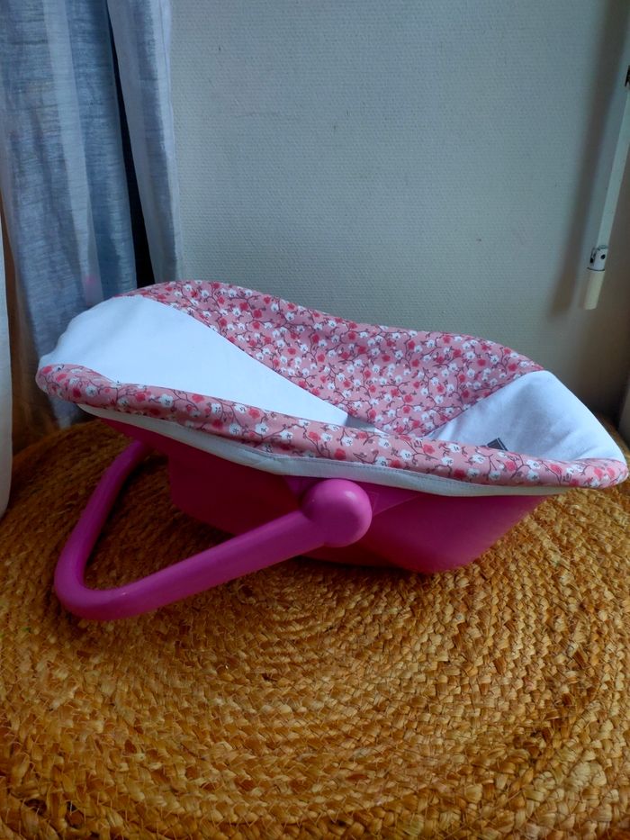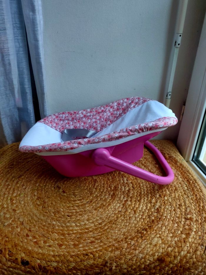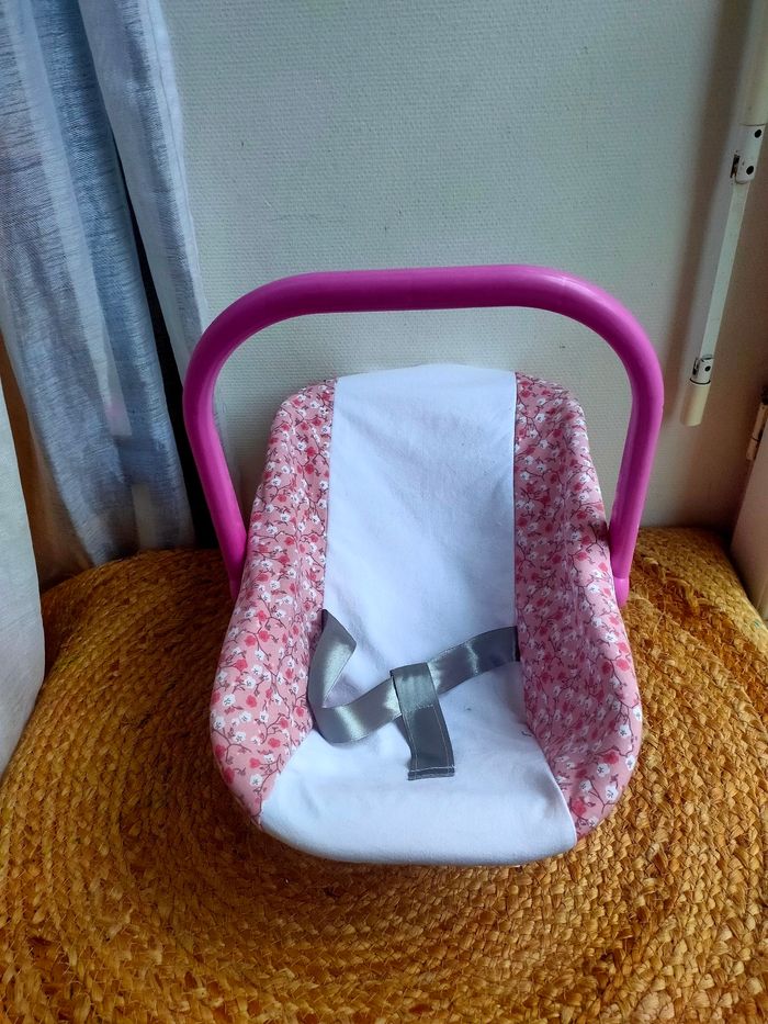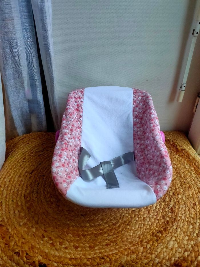 Cosy pour poupée coloris rose et blanc motifs fleurs de cerisier. Sangle pour maintenir la poupée. Le cosy est d'occasion, il a quelques traces, la housse du cosy et neuve et a été faite a la main. De ce fait le cosy est unique, il n'y en aura pas 2 comme celui-ci.