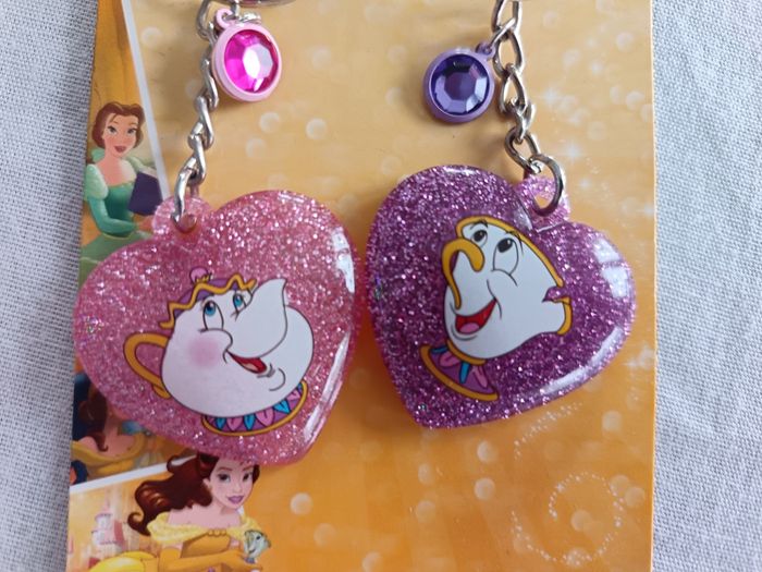 Lot de 2 portes clés La Belle et la Bête 1 cœur rose pailleté : Madame Samovar 1 cœur violet pailleté : Zip Neuf