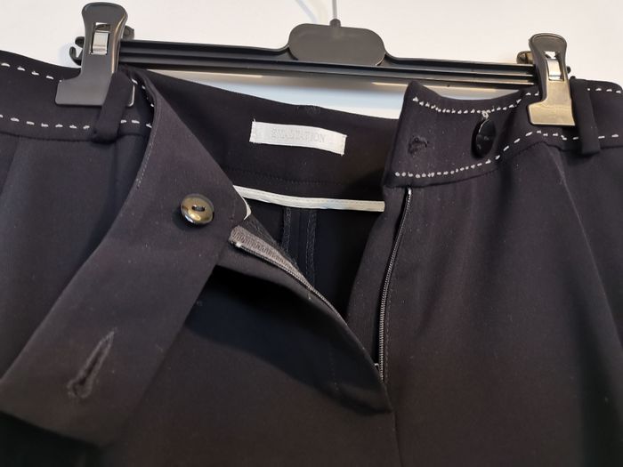Pantalon fermé par un zip et un bouton intérieur, patte avec bouton décalé sur le côté. Passants ceinture.