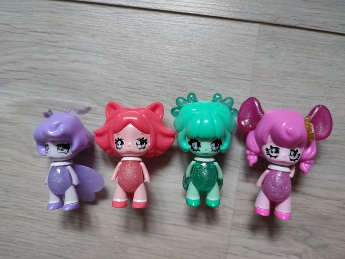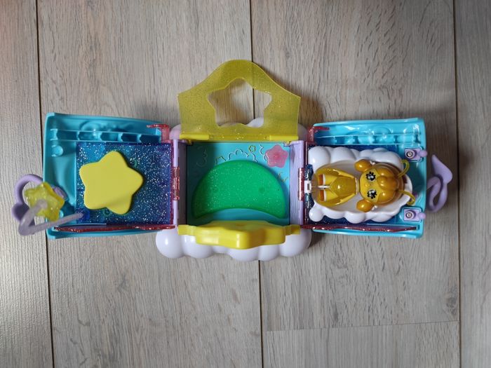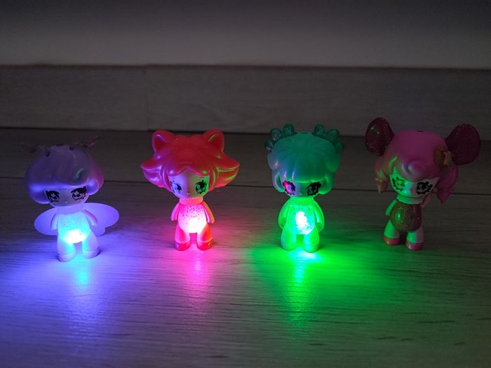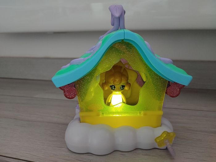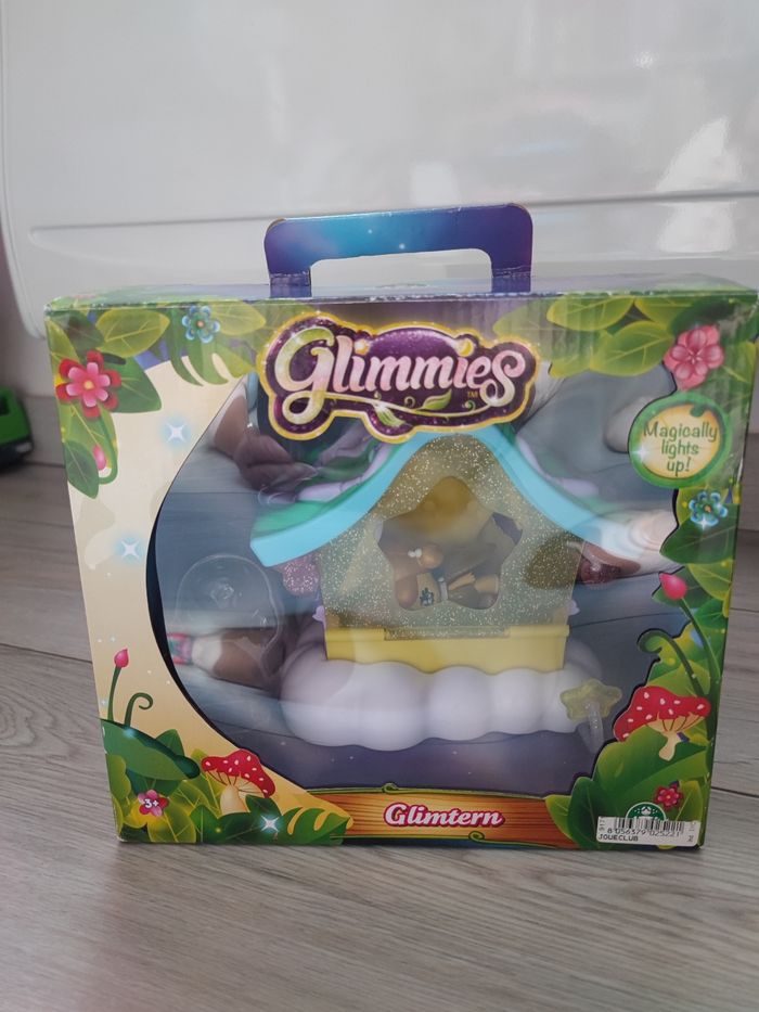 Glimmies dans sa maison transportable La fée s'illumine dans le noir Fourni avec 4 glimmies supplémentaires Toutes s'illuminent exceptée 1 (pile à changer) Très bon état Fourni dans son emballage d’origine