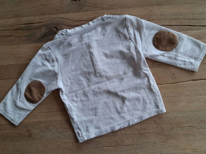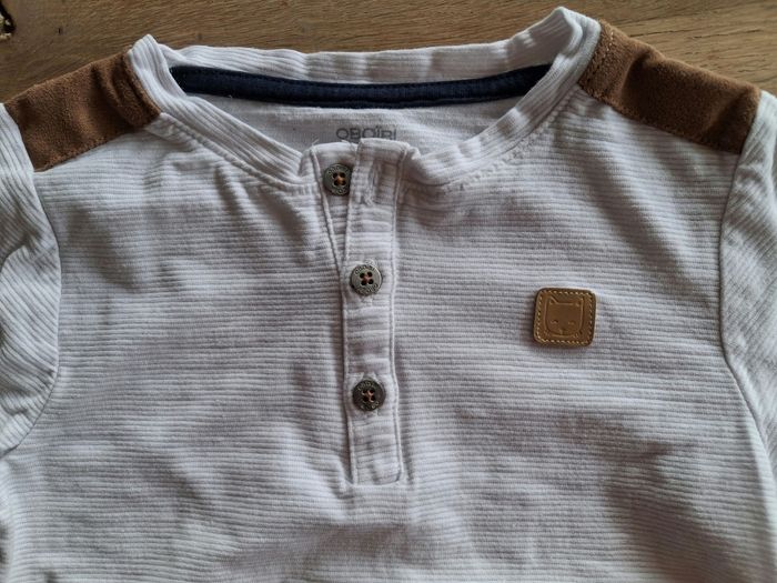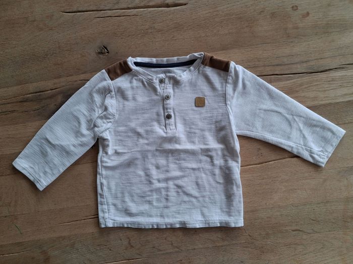 Tshirt garçon manches longues Obaibi 18 mois Blanc avec empiècement camel sur épaules et coudes État comme neuf Remis en main propre sur Dax Ou envoi