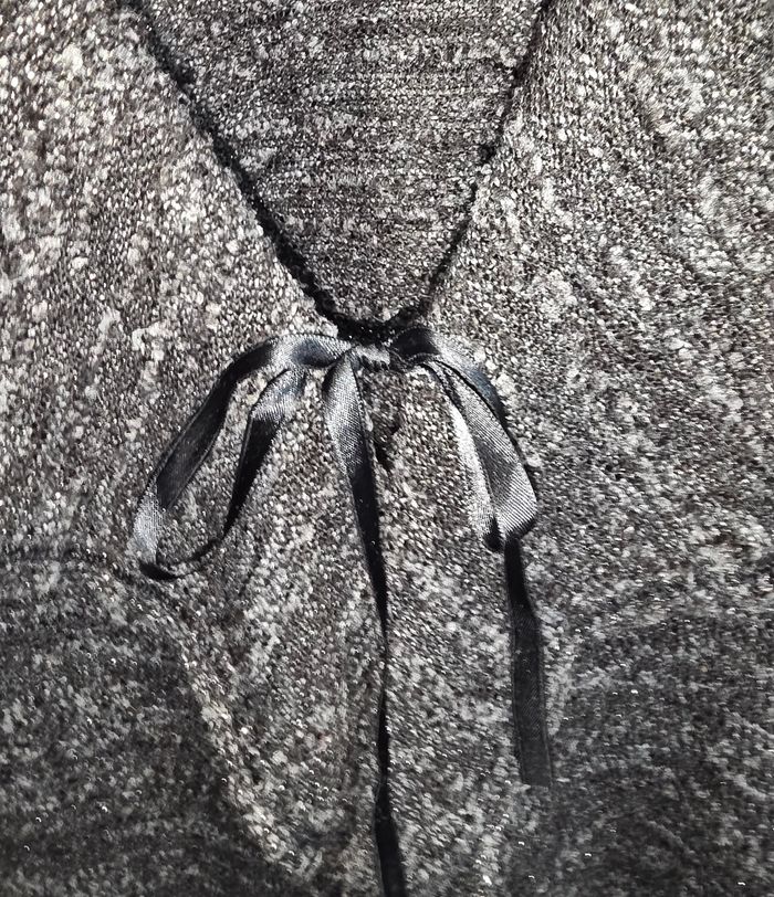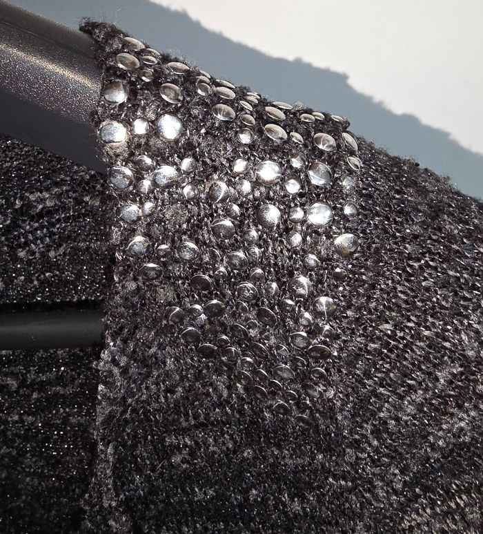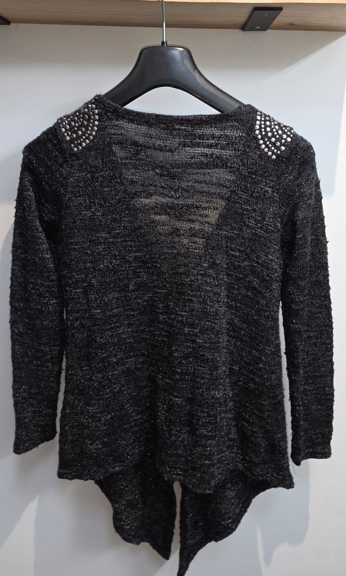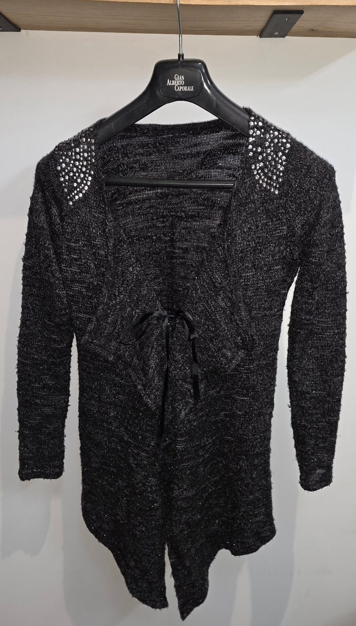 Gilet noir argenté a manche longue. Ouvert, attacher par un nœud noir. Détails argentés aux épaules ( manque quelques strass, voir photos). Marque inconnu en taille S/M. Remises sur lots activé ✅️ De plus, moins de frais de livraison 🪙📦 Envois rapide et soigné ! 🚚