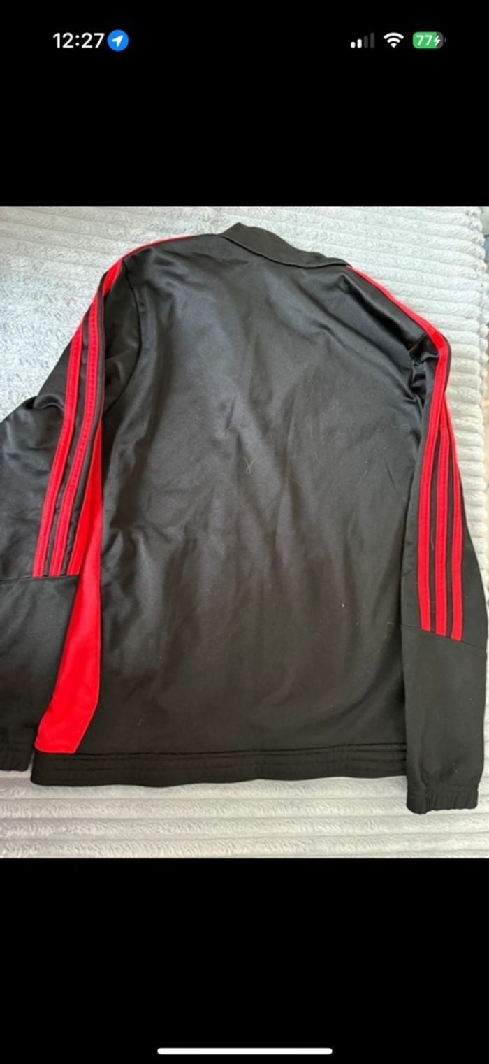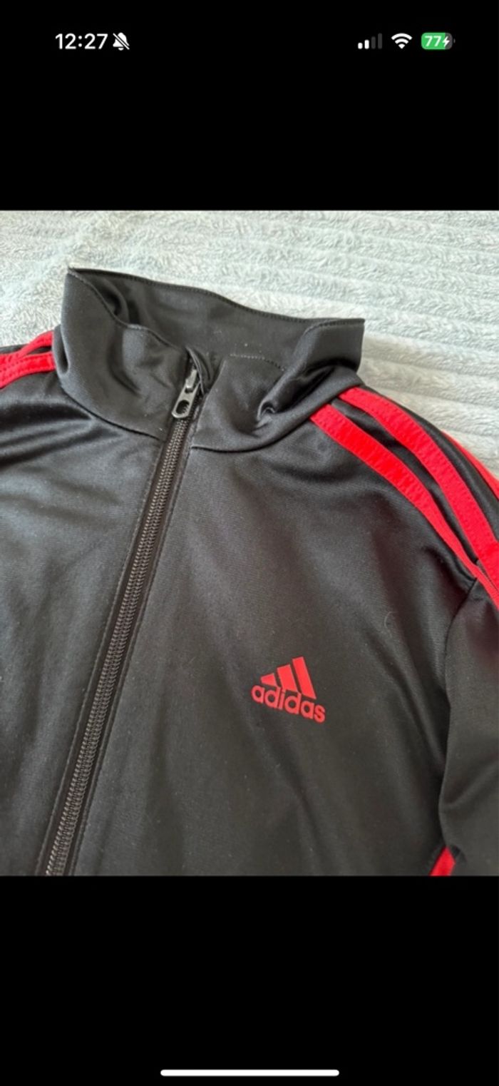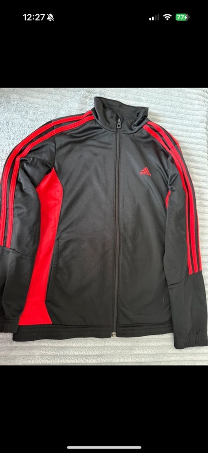 🧥 Veste de jogging Adidas, idéale pour un look sport ou casual. 📏 Taille : 11/12 ans ⚪ Couleur : noire et rouge 🏷️ Logo : Adidas sur la poitrine 🔒 Fermeture zippée, col montant, 2 poches latérales 🧼 Très bon état