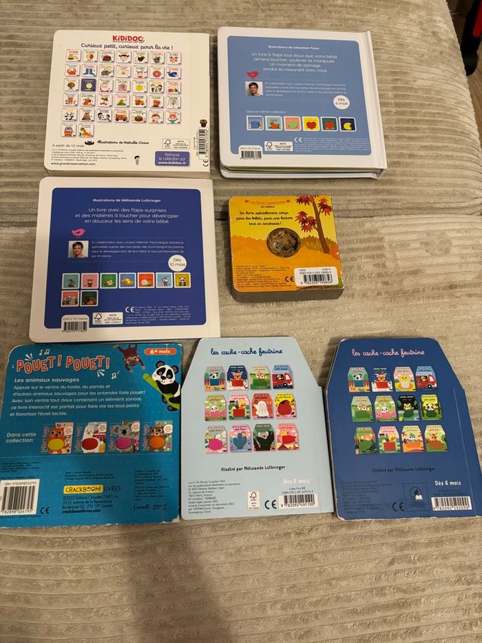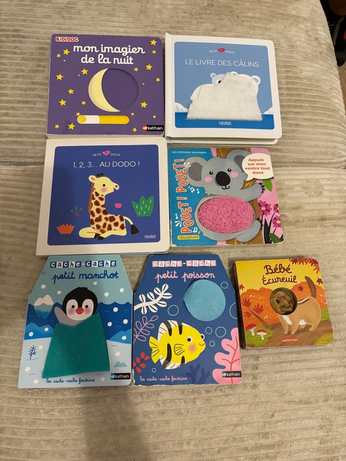 Vends 7 livres en très bon état, très peux servis. Votre bébé aimera toucher, soulever et manipuler les différents livres.