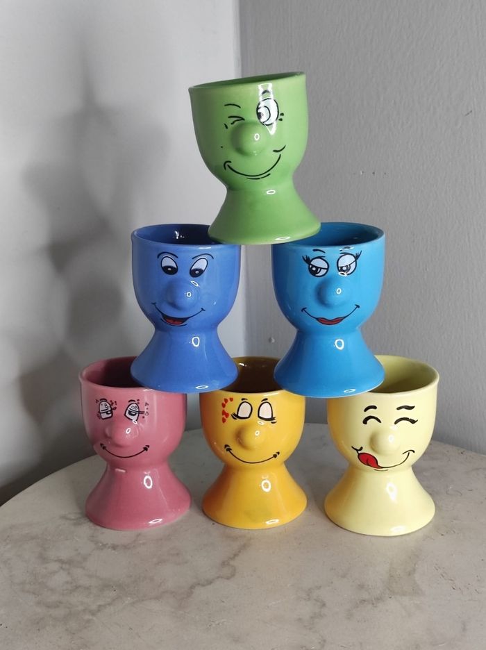Ensemble de 6 petits coquetiers en grès avec des visages smiley en plusieurs couleurs. En parfait état Dimension H 6 cm x D 4,5 cm