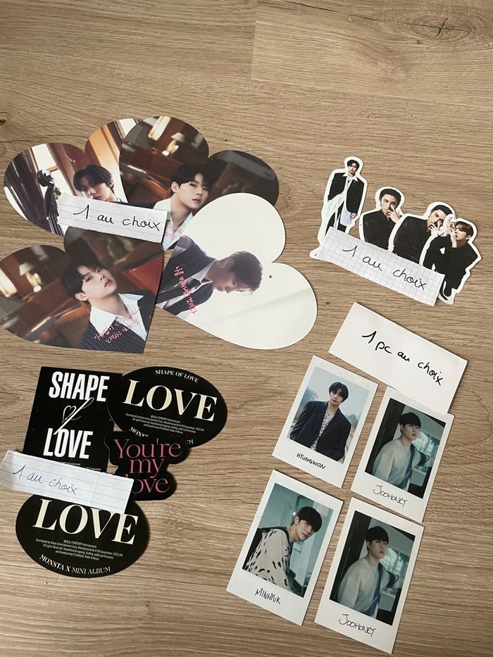 vnted et le bon coin : woosanra beebs : floraritz 📓 shape of love 👥 Monsta X #woosanraMONSTAX 🗂️ version Everything 📔 inclus avec photocard Minhyuk et les pre-ordre benefit sauf la photocard unit, vous pouvez choisir les inclusions: stickers membres: ✅changkyun x2 ✅kihyun ✅hyungwon stickers: ✅love x2 ✅shape of love ✅you’re my love polaroïd: ✅hyungwon ✅jooheon x2 ✅minhyuk cœur: ✅jooheon x2 ✅hyungwon ✅kihyun poster: ✅changkyun ✅minhyuk ✅hyungwon x2 🔎 très bon état ➕ les trois autres versions sont disponibles dans mon dressing