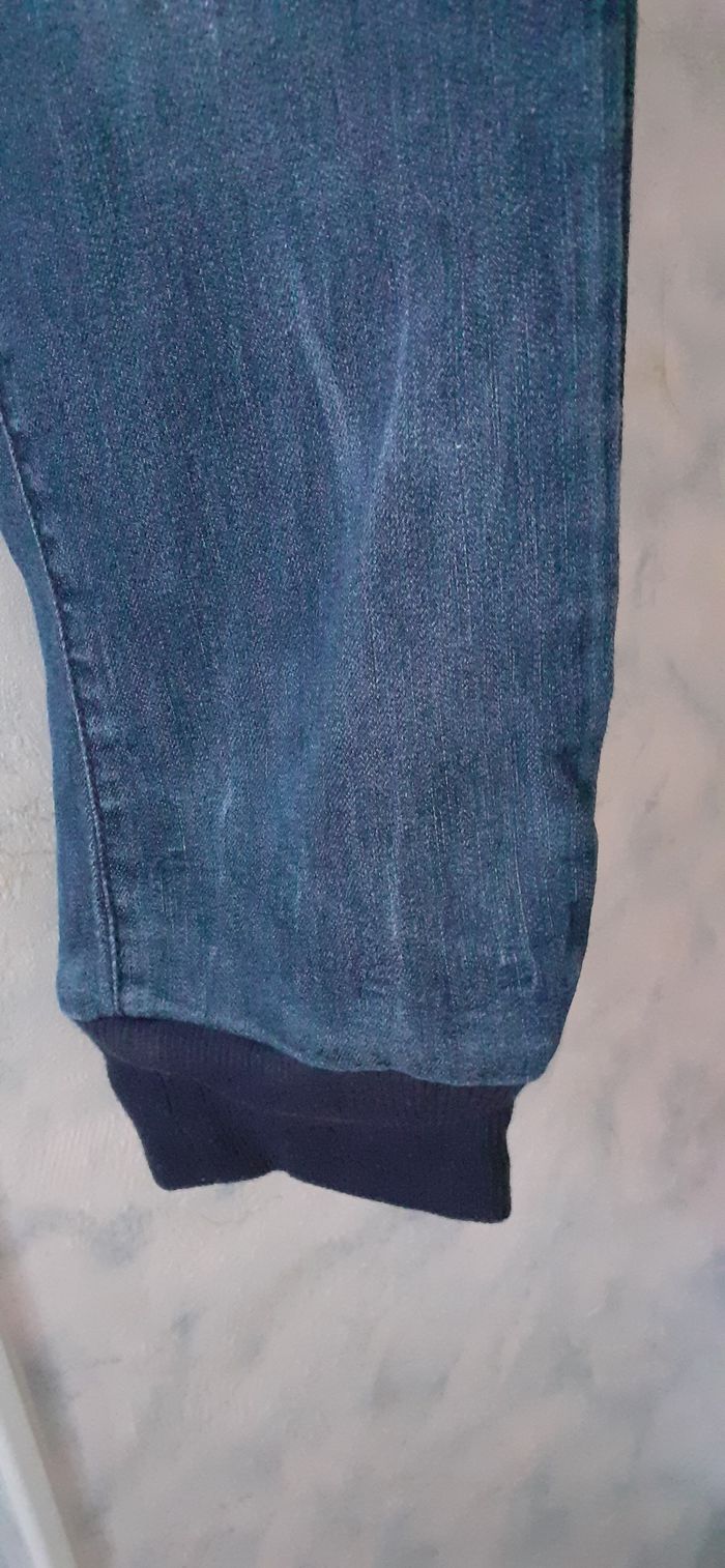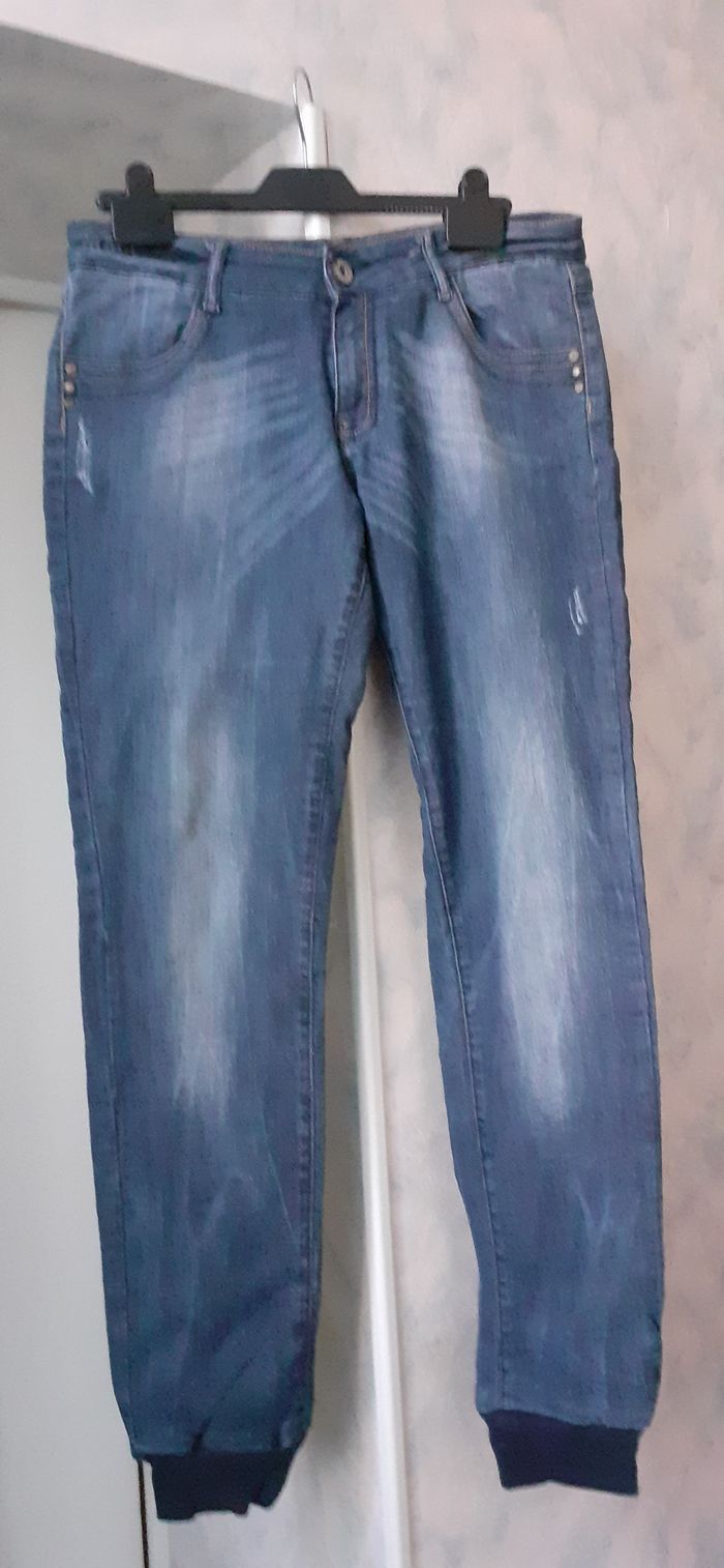 Vends un jean souple 75 % coton, 23 % polyester, 2 % élasthanne, taille basse, resserré aux chevilles comme un jogging, couleur bleu, marque Ellos, JSfn Denim, taille 31-32 (38-40). Longueur entrejambe : 80 cm.