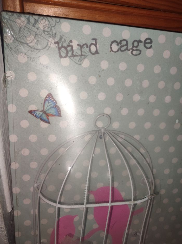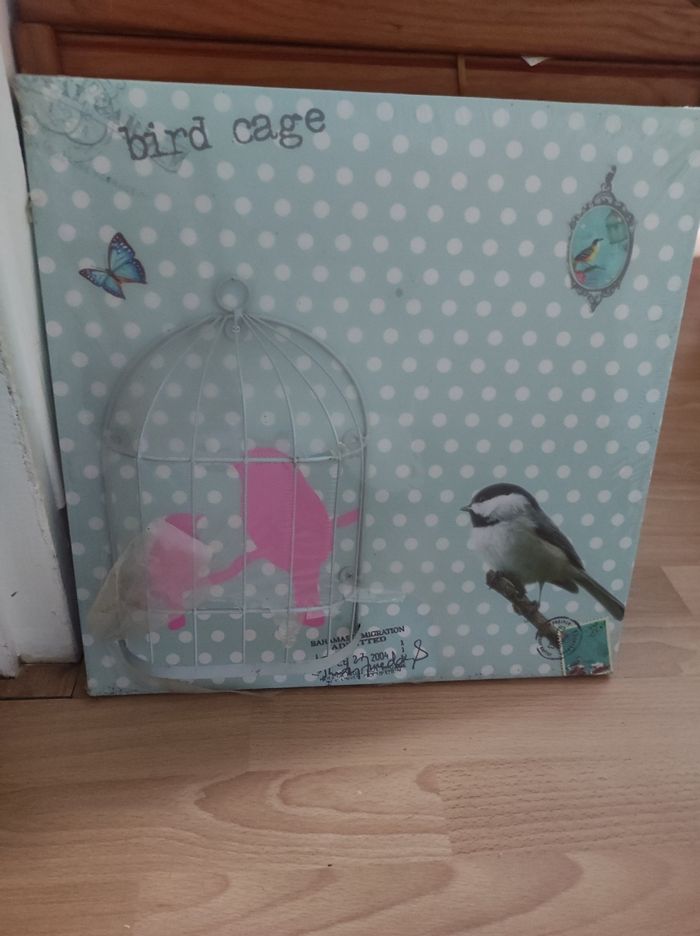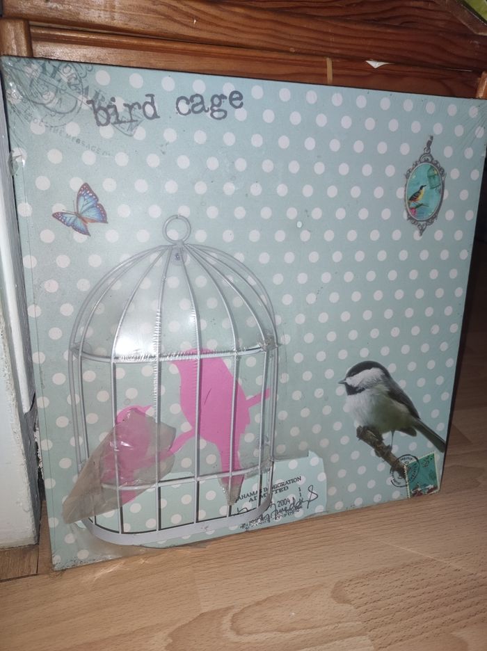 Cadre oiseau en cage 40x40 neuf Bird cage toile imprimée Cage en relief Encore sous film plastique (arraché en bas de la cage)
