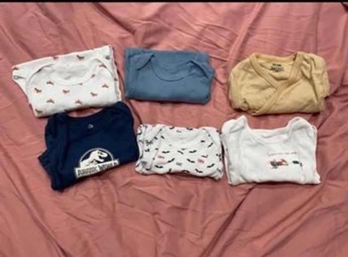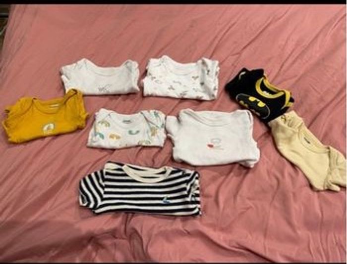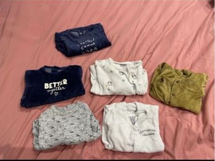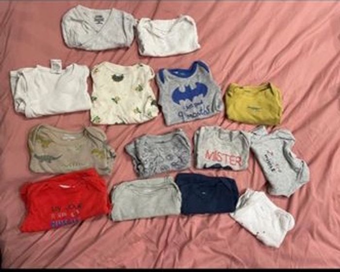 Vêtements 3 mois : -5 tee shorts manches longues - 1 tee shirt manche courte - 20 bodys manches longues - 8 bodys manches courtes - 6 pyjamas - 6 pantalons - 1 pyjama sans pieds - 7 ensembles - 2 gilets - body/tee shirt