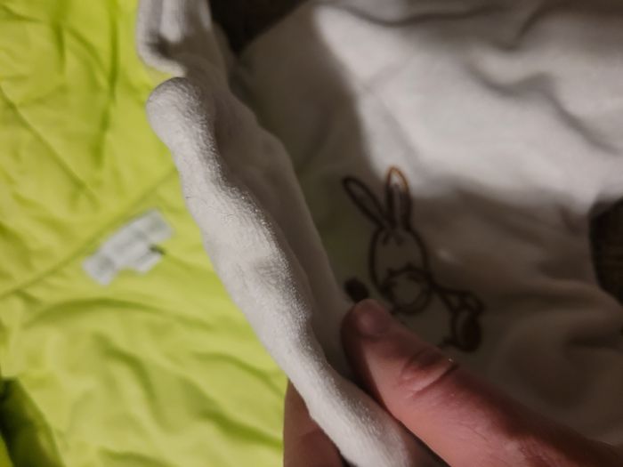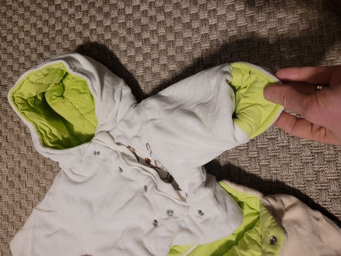 Manches : Les extrémités des manches peuvent être repliées sur les mains (poignets doublés vert anis).