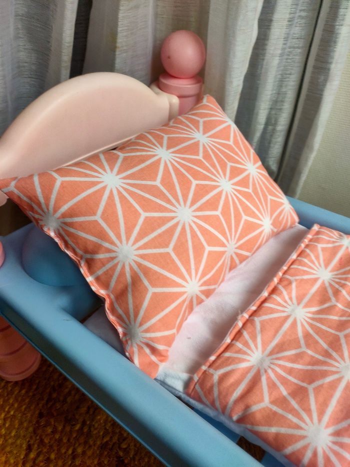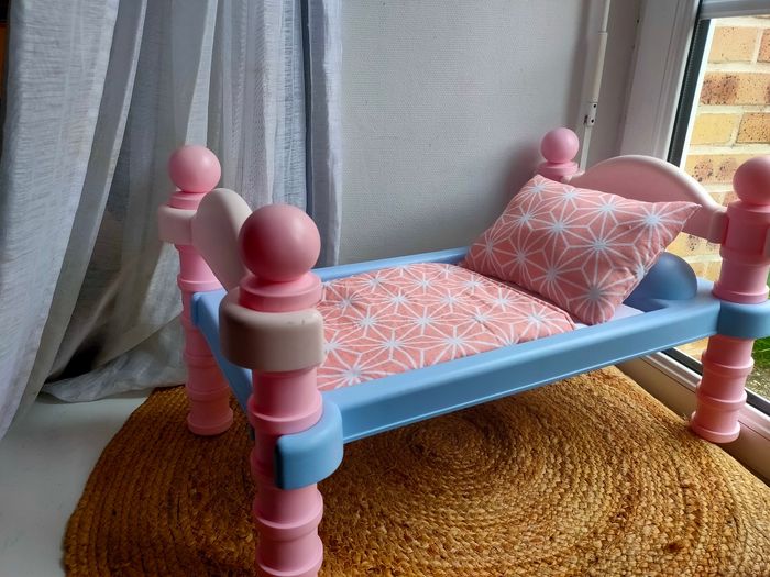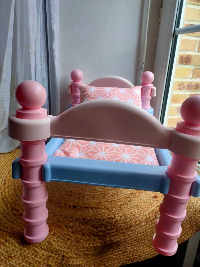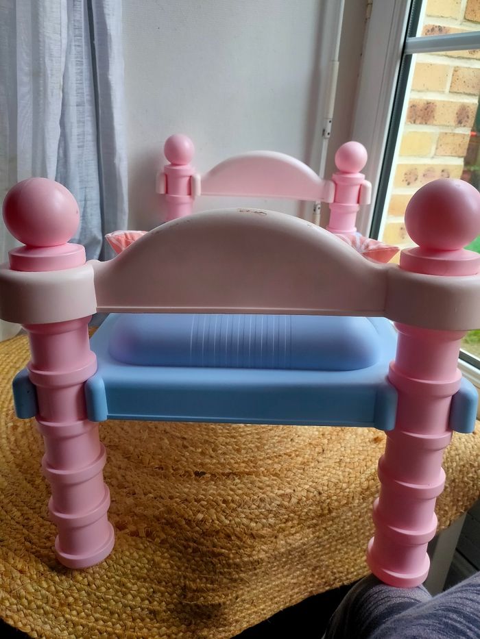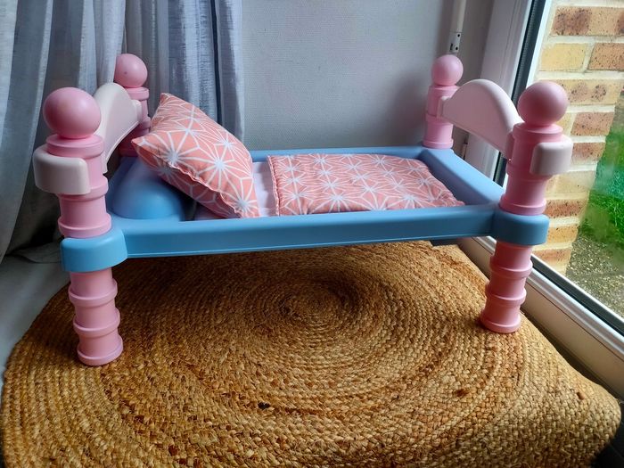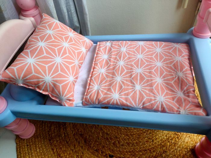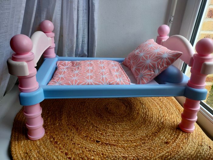Lit poupée Vintage avec sommier a lattes, coloris bleu et rose, entièrement en plastique, il est démontable. Il est vendu avec sont lingue de lit coloris rose et blanc et son oreiller bien moelleux, ils ont été faites à la main ce qui rends le lit Unique. Le lit a été manipulé, le linge de lit est Lui neuf.