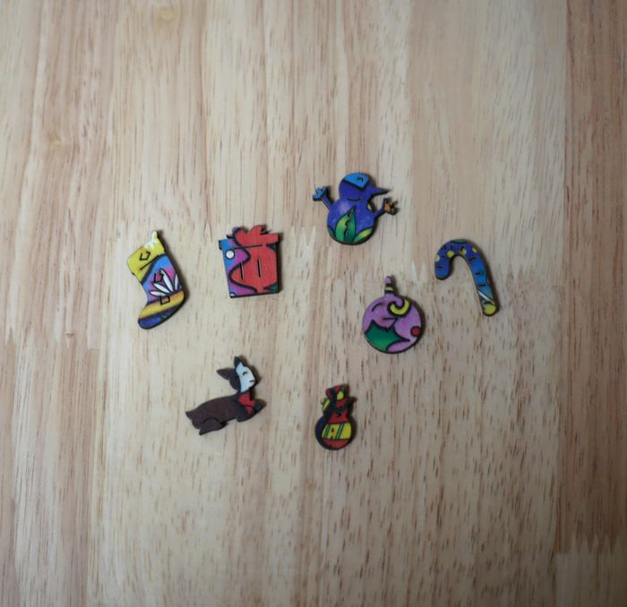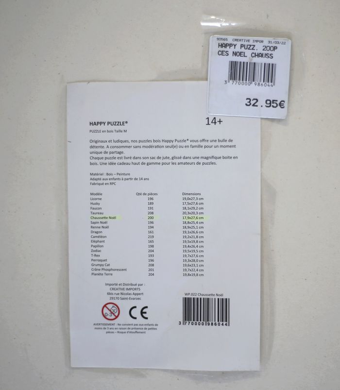 Puzzle en bois (200 pièces précises) "Christmas Socks" marque Happy Puzzle (32,95e prix neuf, acheté en espace culturel et non sur des sites chinois). Acheté neuf et fait une seule fois. Complet (attention : il y a de toutes petites pièces, je le garantis complet 200 pièces piles, soyez prudent en ouvrant pour ne pas en perdre). Pièces remises en pochon tissu inclus. Formes de pièces originales par endroits, voir photos. Envoi rapide et soigné, prix ferme merci. Taille finale : 17,9 cm x 27,6 cm Puzzle magnifique à assembler, hyper coloré, pour les amateurs de puzzles en bois. Joyeuses fêtes à vous tous !