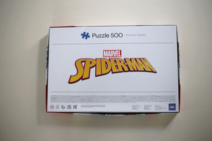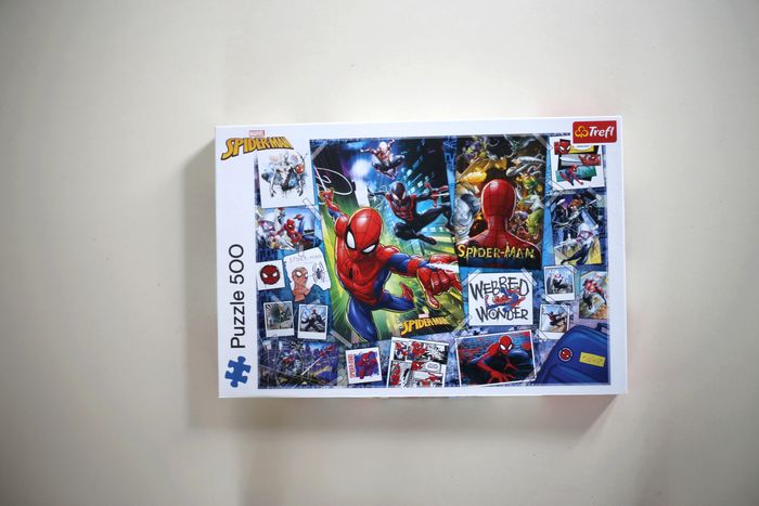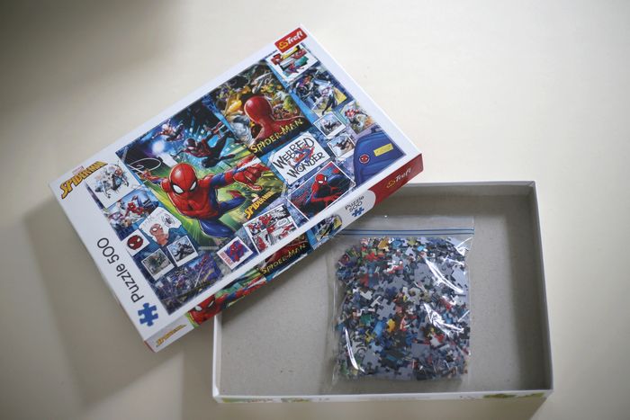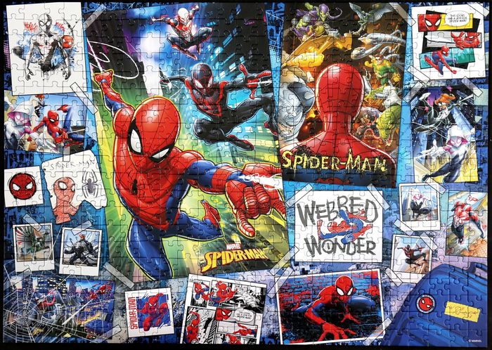 Puzzle 500 pièces Affiches Spiderman Marvel marque Trefl, complet (20 x 25 bords = 500 pièces), en très bon état, acheté neuf et fait une fois. Pièces remises en sachet zippé.