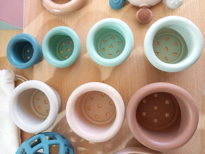 🧸 Kit jouet d'éveil pour bébé: Inclus 1 hochet, 1 anneau de dentition, 7 tasses empilables, 1 balle sensorielle, 2 bateaux jouet bain bébé et 1 sac de transport. Boîte à formes sur le dessus, jeux de découverte dessous, le coffret est aussi un jeu ! Contenu additionnel offert : carte de visions à imprimer, guide Montessori et musiques.