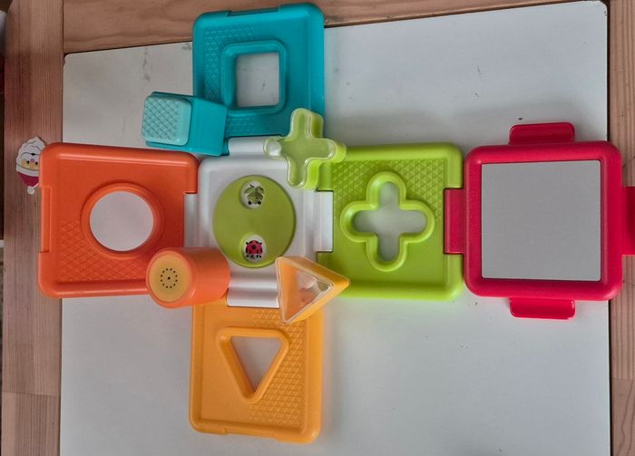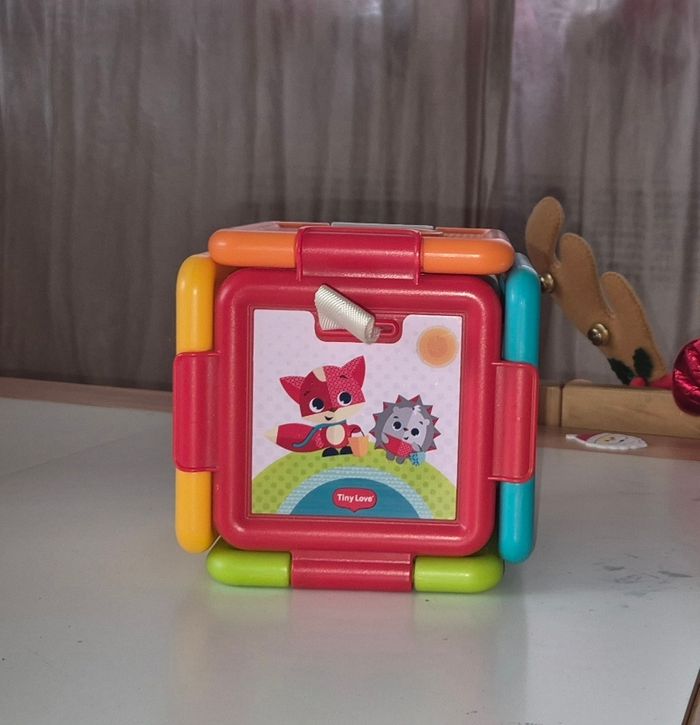 Cube d’activités de la marque Tiny Love, avec plusieurs faces de jeu pour stimuler l’éveil et la motricité fine.