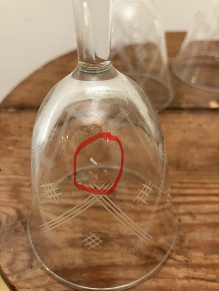 Cet ensemble comporte 6 verres anciens pour les vins cuits ou la liqueur. Ils sont en bon état : ni ébréchés, ni fêlés ⚠️ toutefois présence sur l’un d’entre eux d’une petite bavure (voir photo) Ils sont finement striés : sérieux de 3 fines striures qui s’entrecoupent. Fabrication française : la mention France est indiquée sous le pied. Dimensions : - hauteur : 11,5 cm - diamètre : 6,5 cm