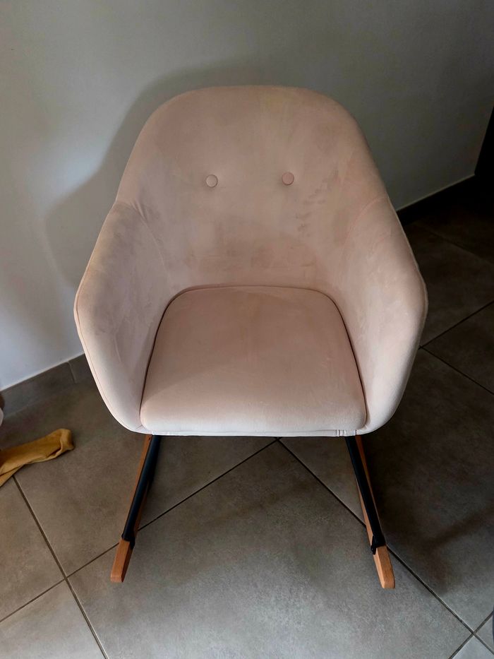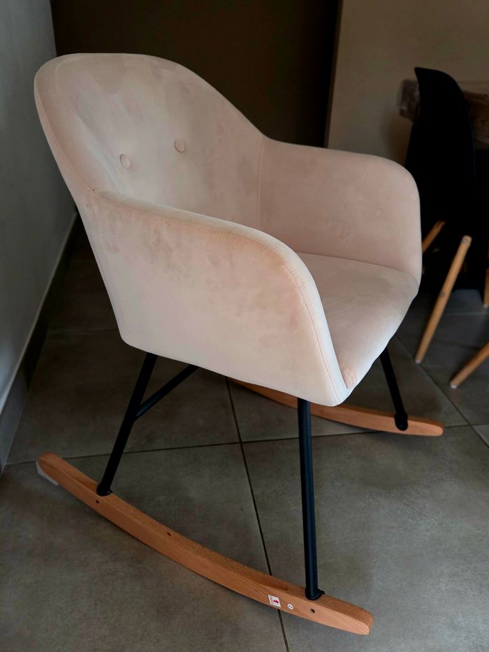 Fauteuil berçant doté de deux patins incurvés en bois massif aux pieds métalliques. Vous pouvez vous y balancer d'avant en arrière pour vous détendre dans une position délassante. La surface de la chaise berceuse en velours est douce au toucher. Le siège rembourré rend la chaise à bascule en velours plus confortable